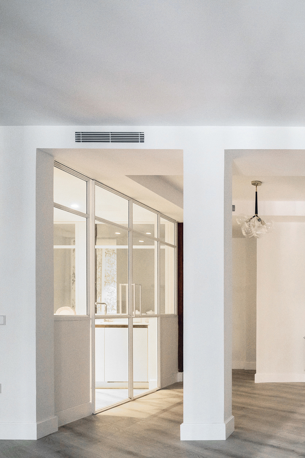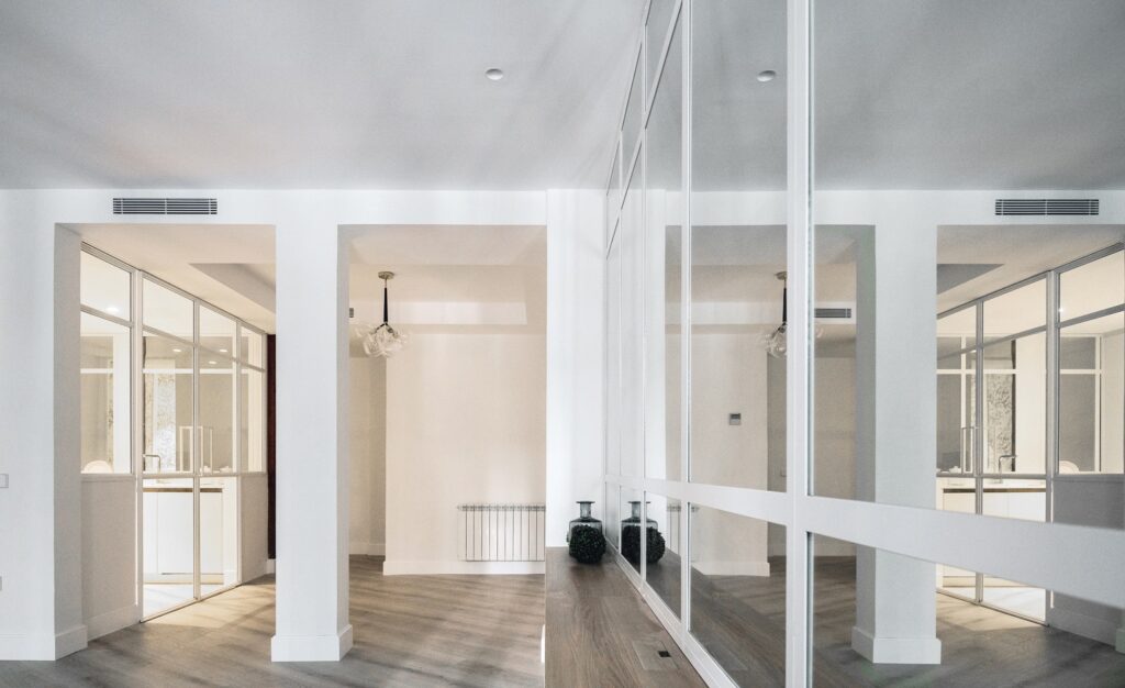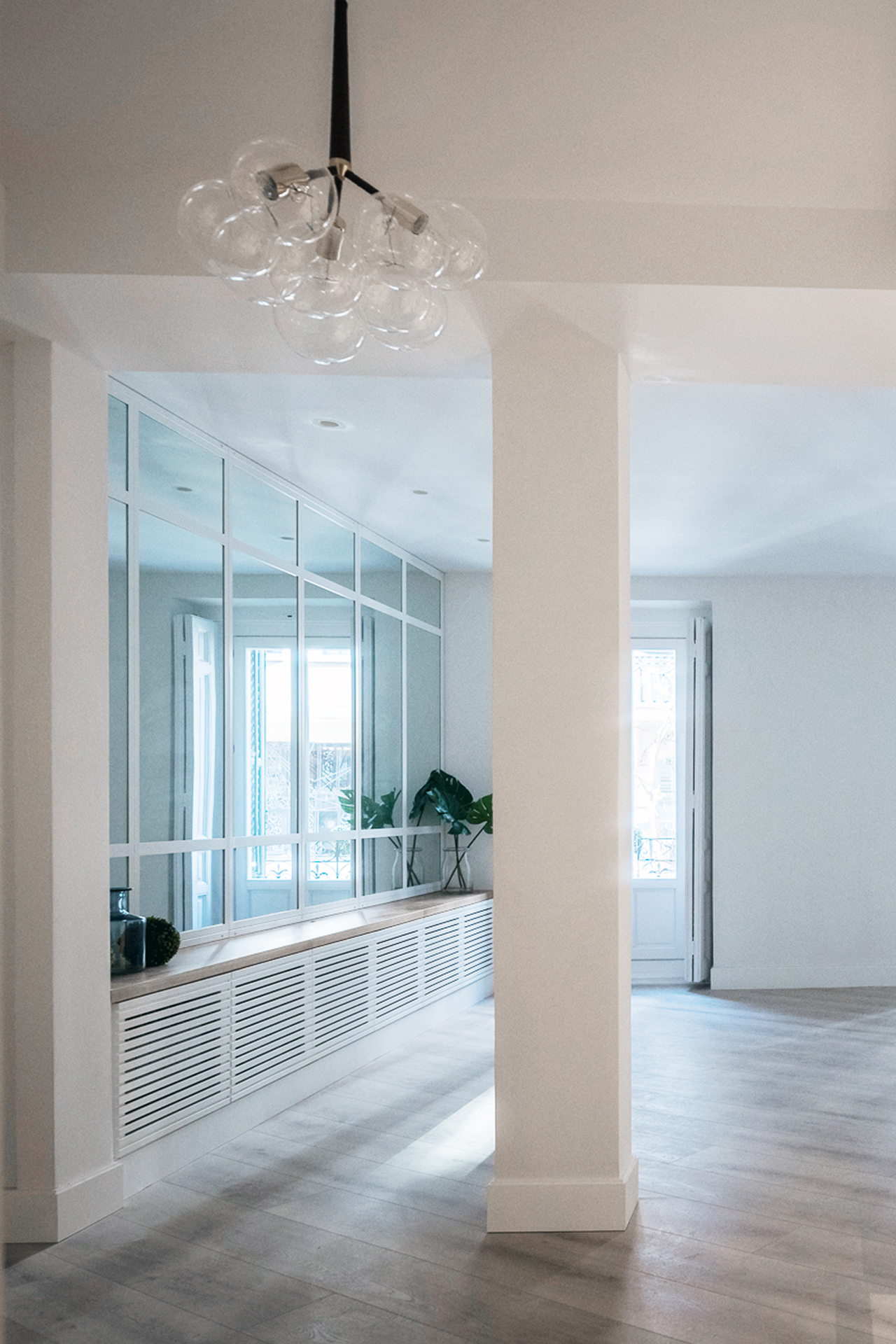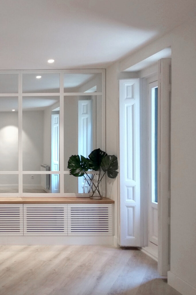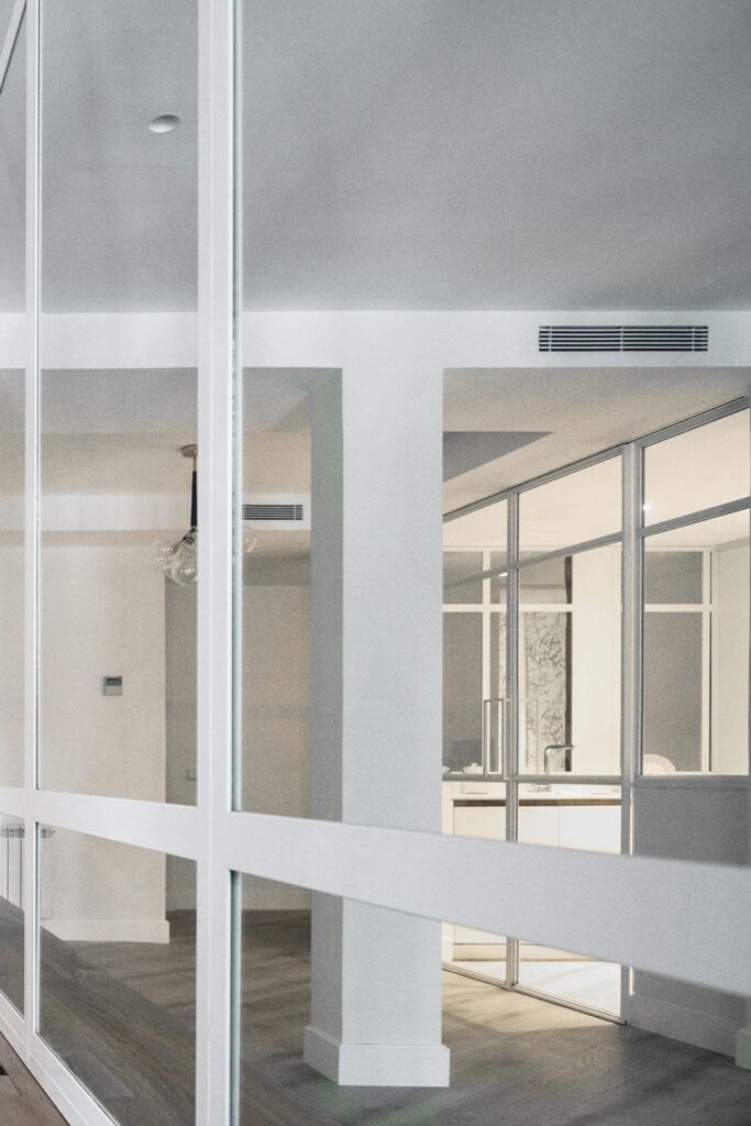 El empleo de paños de espejo y vidrio en los espacios comunes (vestíbulo,salón y cocina) así como en una de las paredes del salón, relacionan unas estancias con otras aportando continuidad a la par que privacidad a los diferentes espacios.