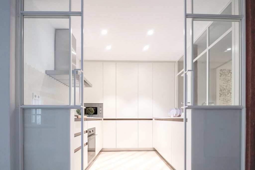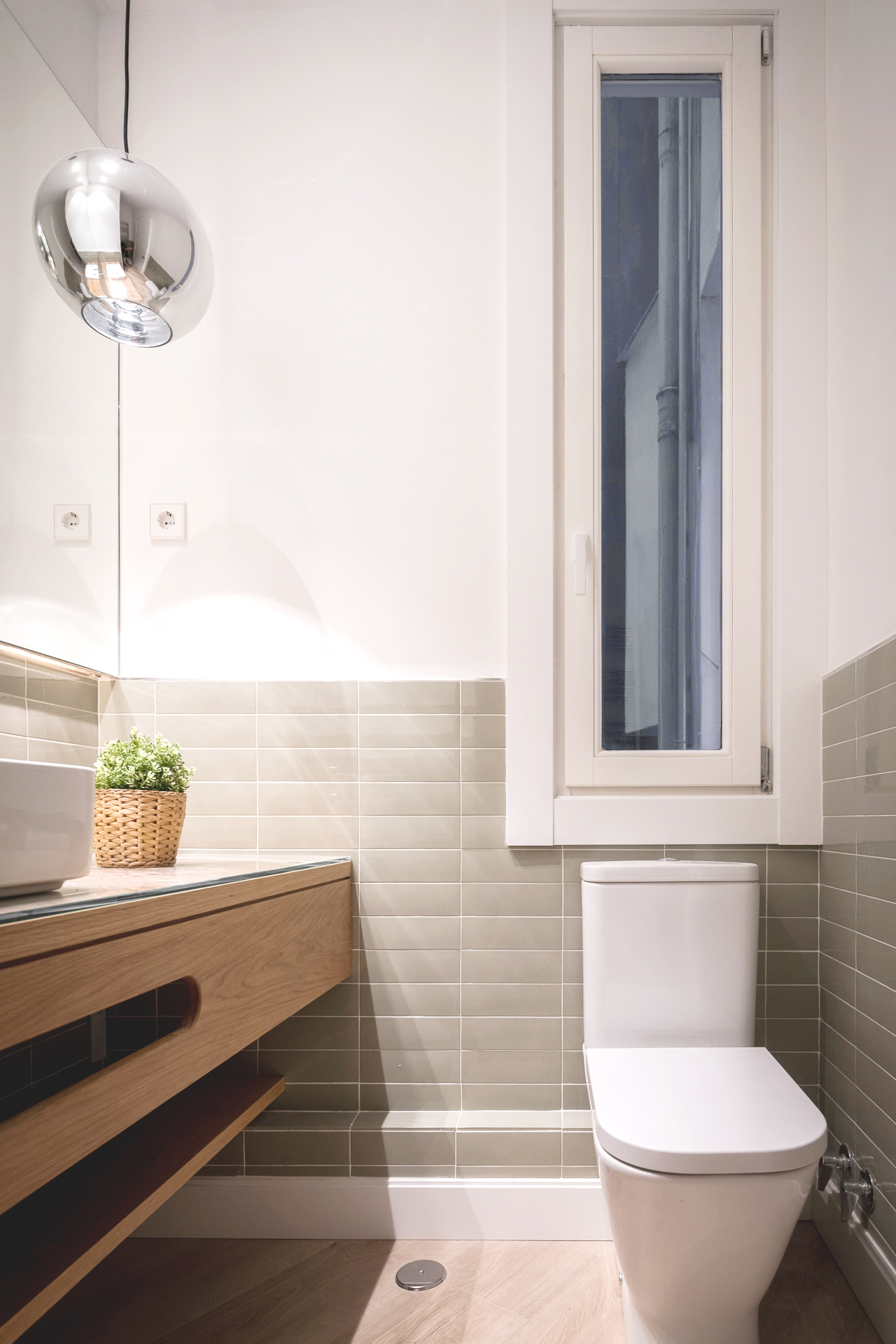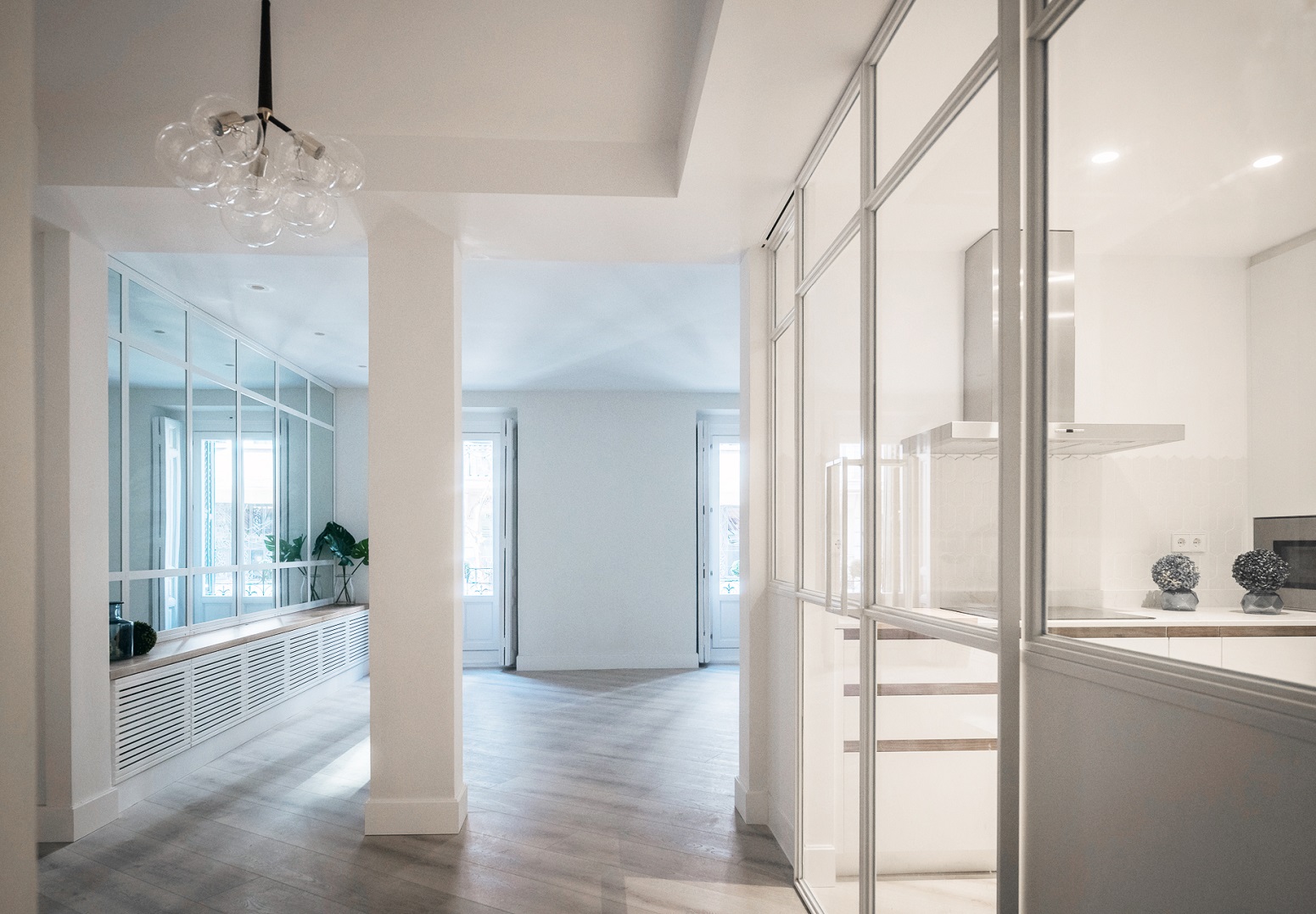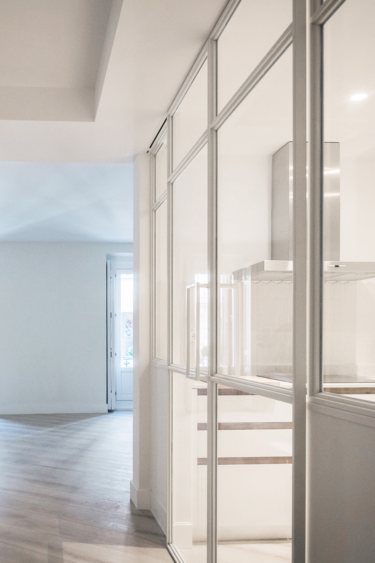 El empleo de paños de espejo y vidrio en los espacios comunes (vestíbulo,salón y cocina) así como en una de las paredes del salón, relacionan unas estancias con otras aportando continuidad a la par que privacidad a los diferentes espacios.