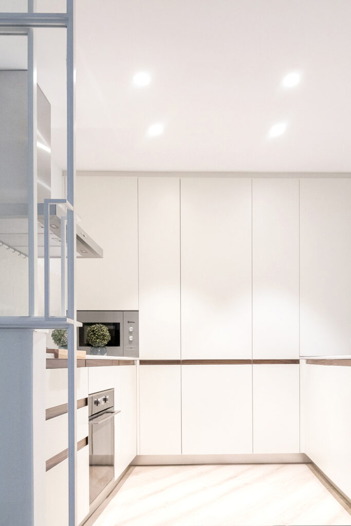 La selección de unos materiales en tonos cálidos, el color blanco escogido en los elementos de cerrajería, la elección de una cocina nórdica con una gola en madera a juego con los pies derechos de madera existentes aportan elegancia y dinamismo a la vivienda.