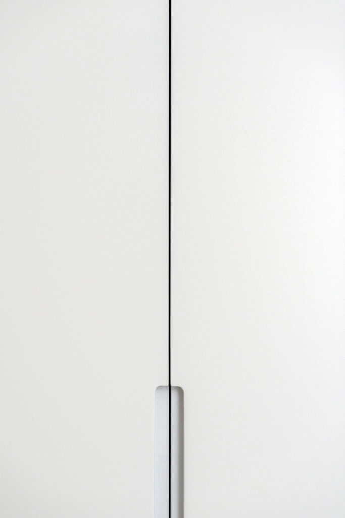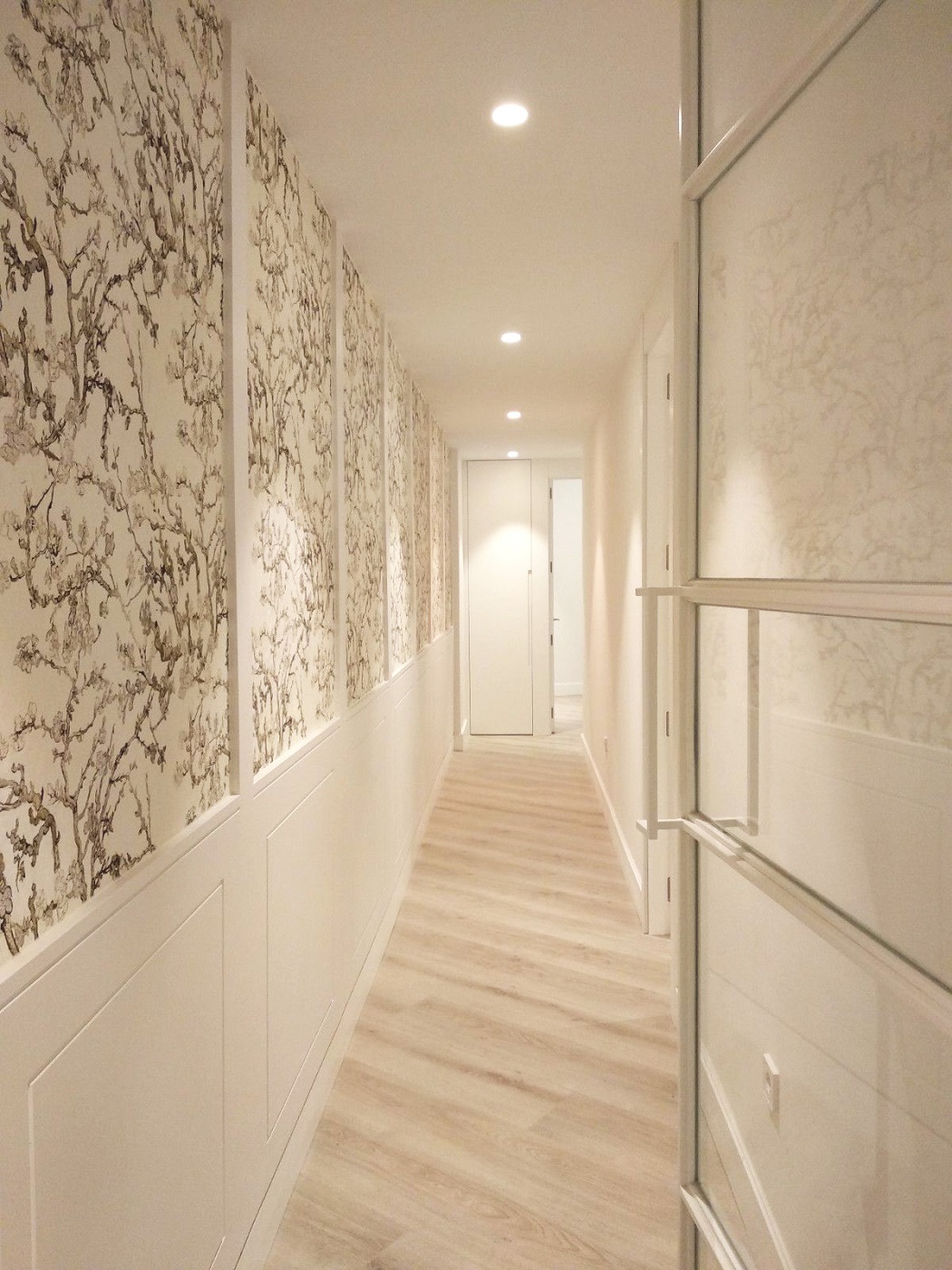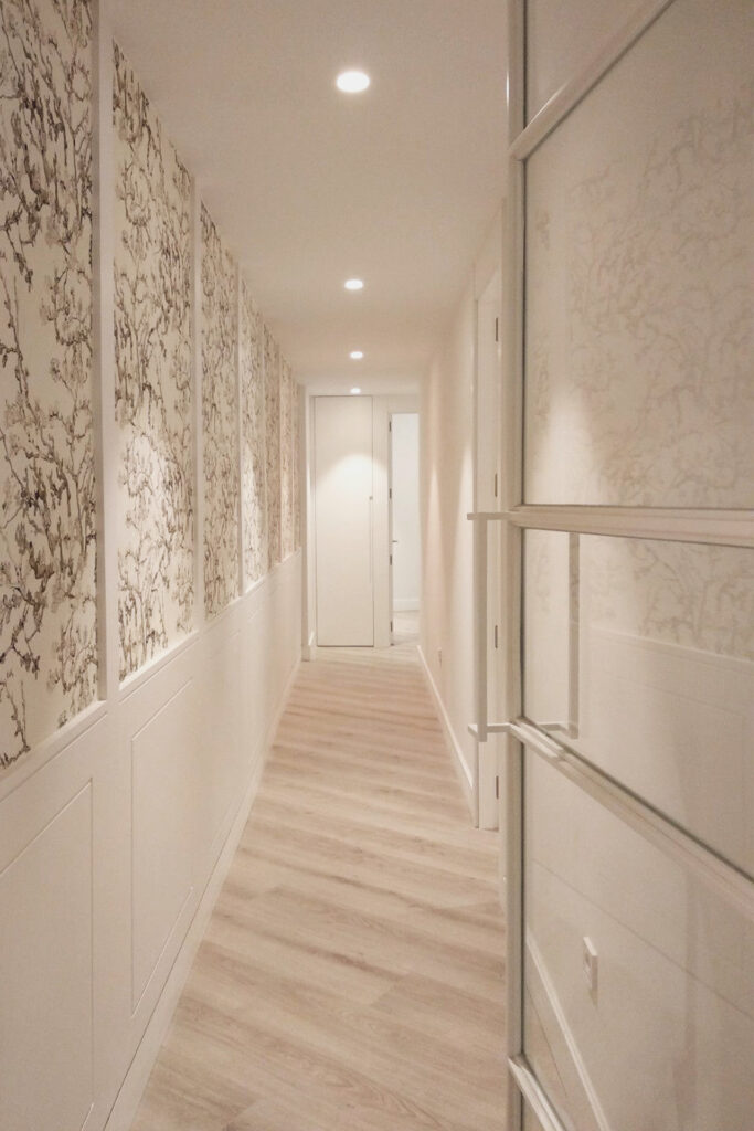 Cabe destacar el empleo de un papel oriental en tonos suaves así como un friso de madera diseñado a medida y lacado en blanco que aportan caracter y presencia al pasillo interior de la casa.