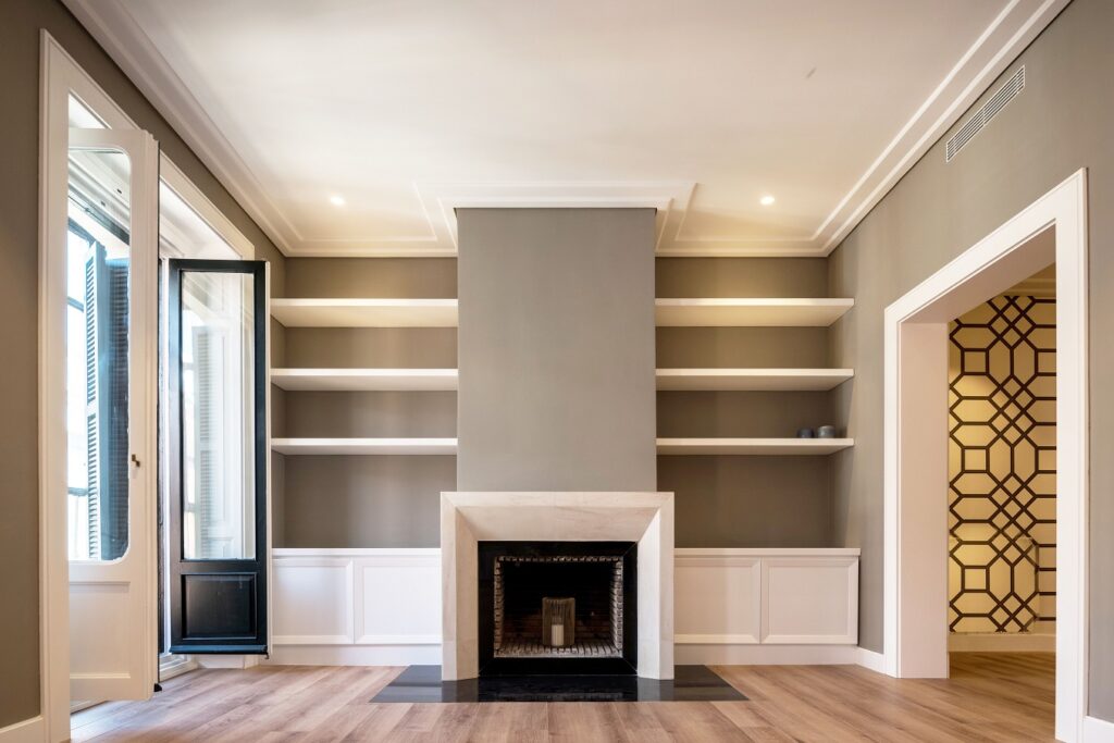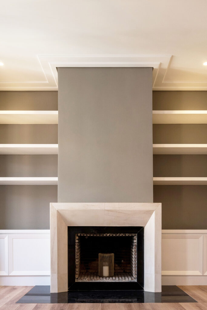 Se respetó la chimenea del salón, la cual se forró de una piedra natural con un diseño único de aristas rectas y ángulos oblicuos realizado en el estudio. Las estanterías laterales se proyectaron en consonancia con el diseño de la la chimenea.