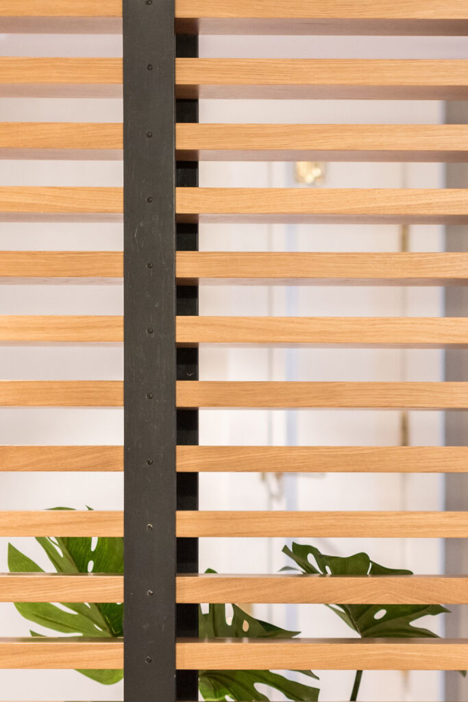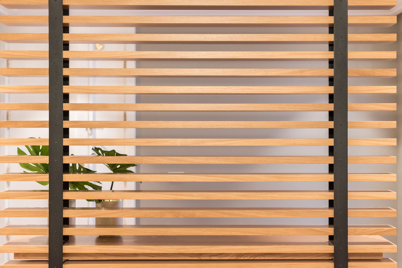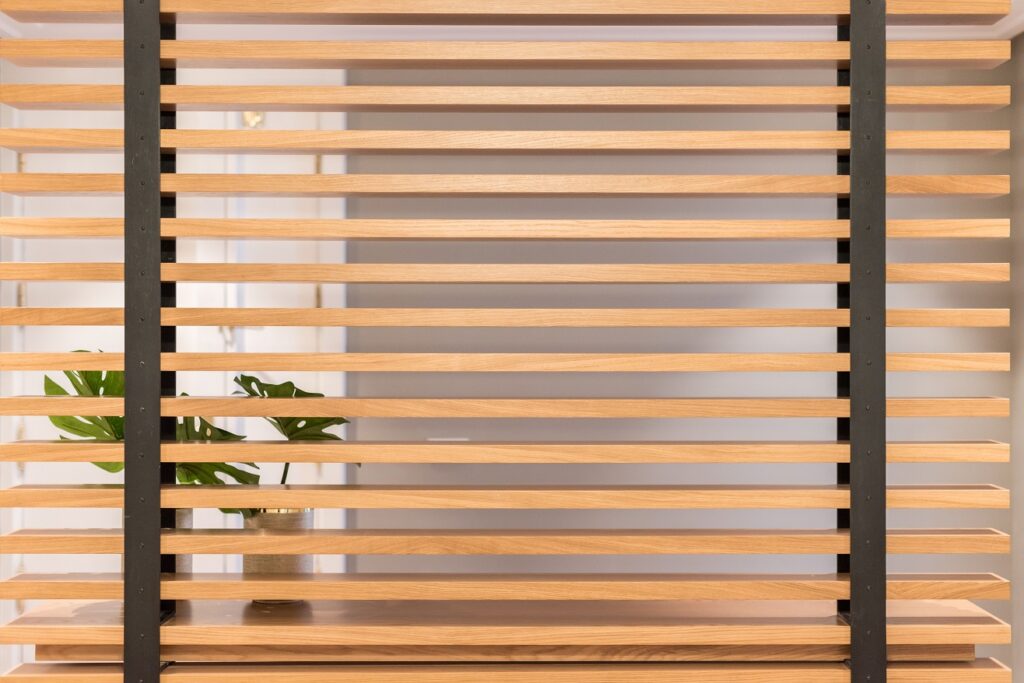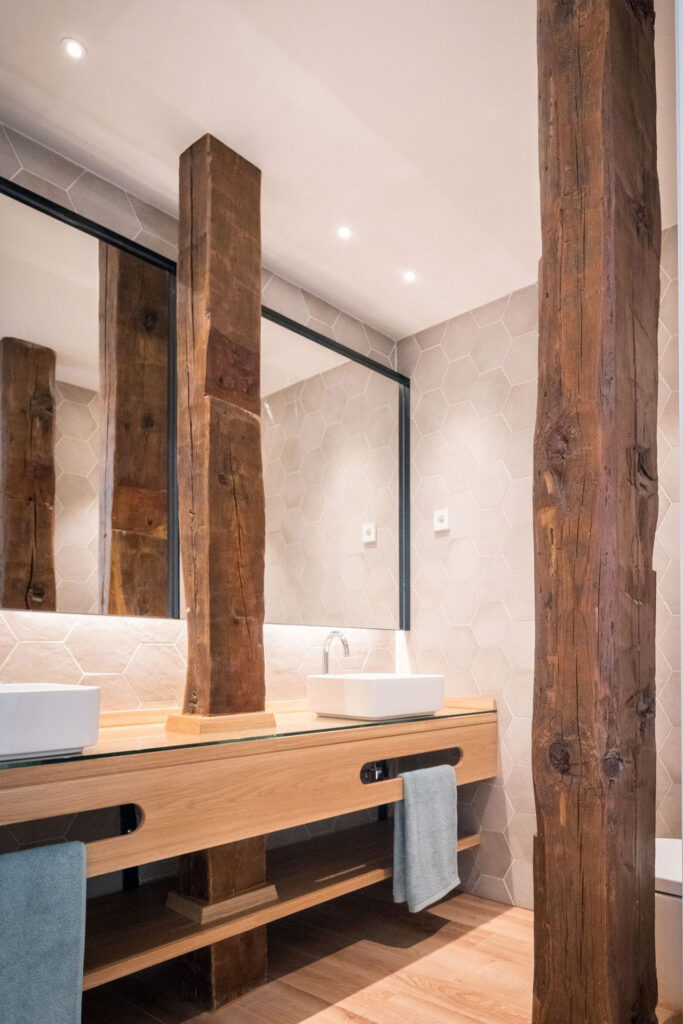 El empleo de madera maciza natural en el resto de elementos de ebanistería diseñados en exclusiva para esta vivienda (mampara divisoria, encimeras…) terminan de aportar calidez a los distintos espacios de esta casa.