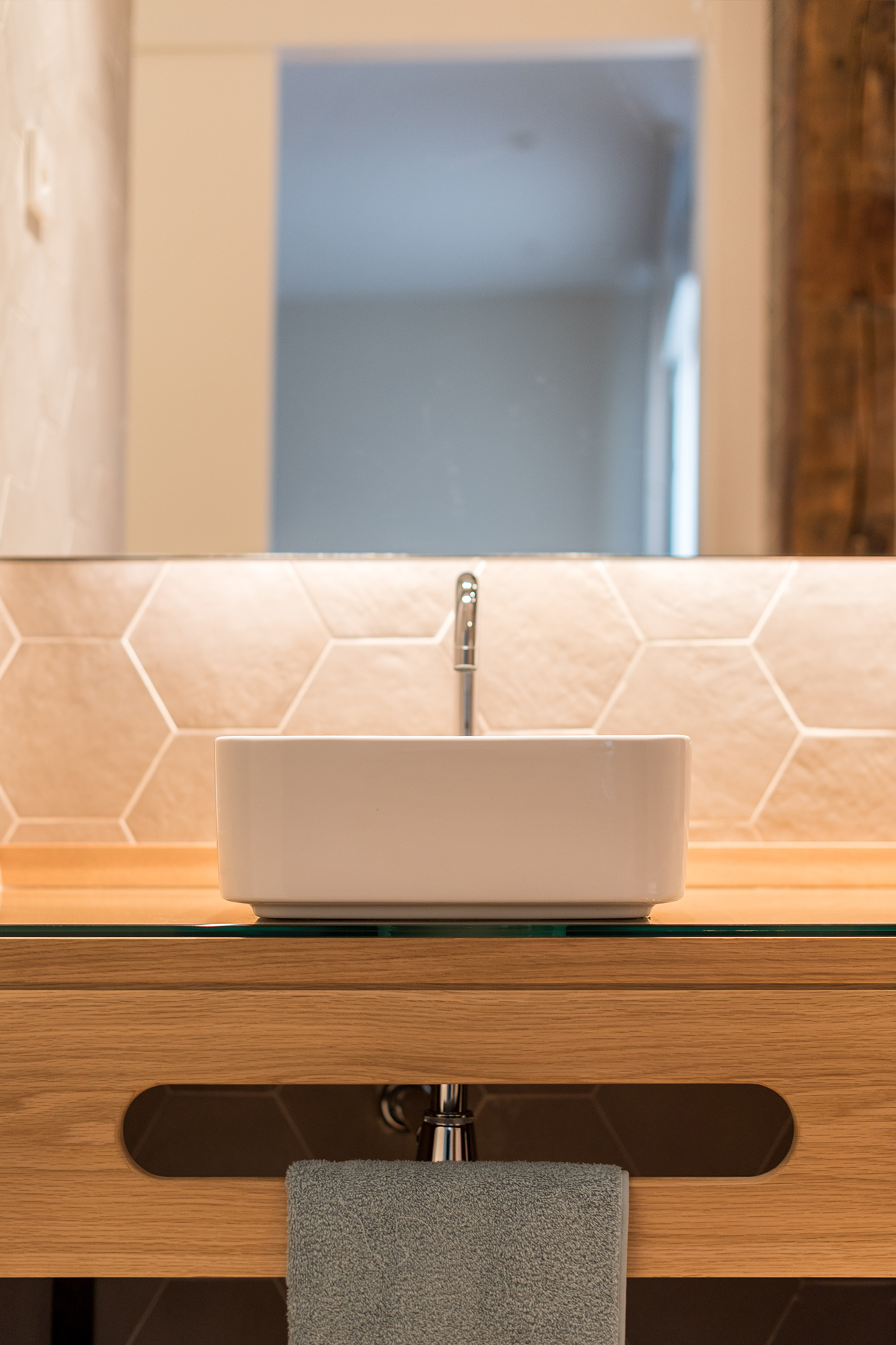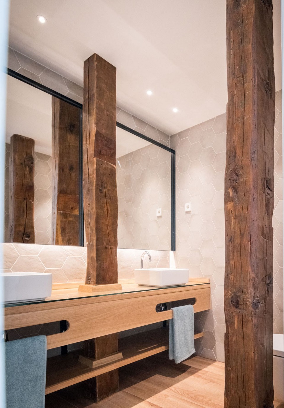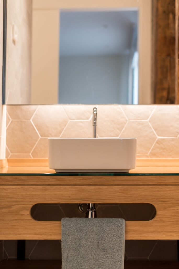 El empleo de madera maciza natural en el resto de elementos de ebanistería diseñados en exclusiva para esta vivienda (mampara divisoria, encimeras…) terminan de aportar calidez a los distintos espacios de esta casa.