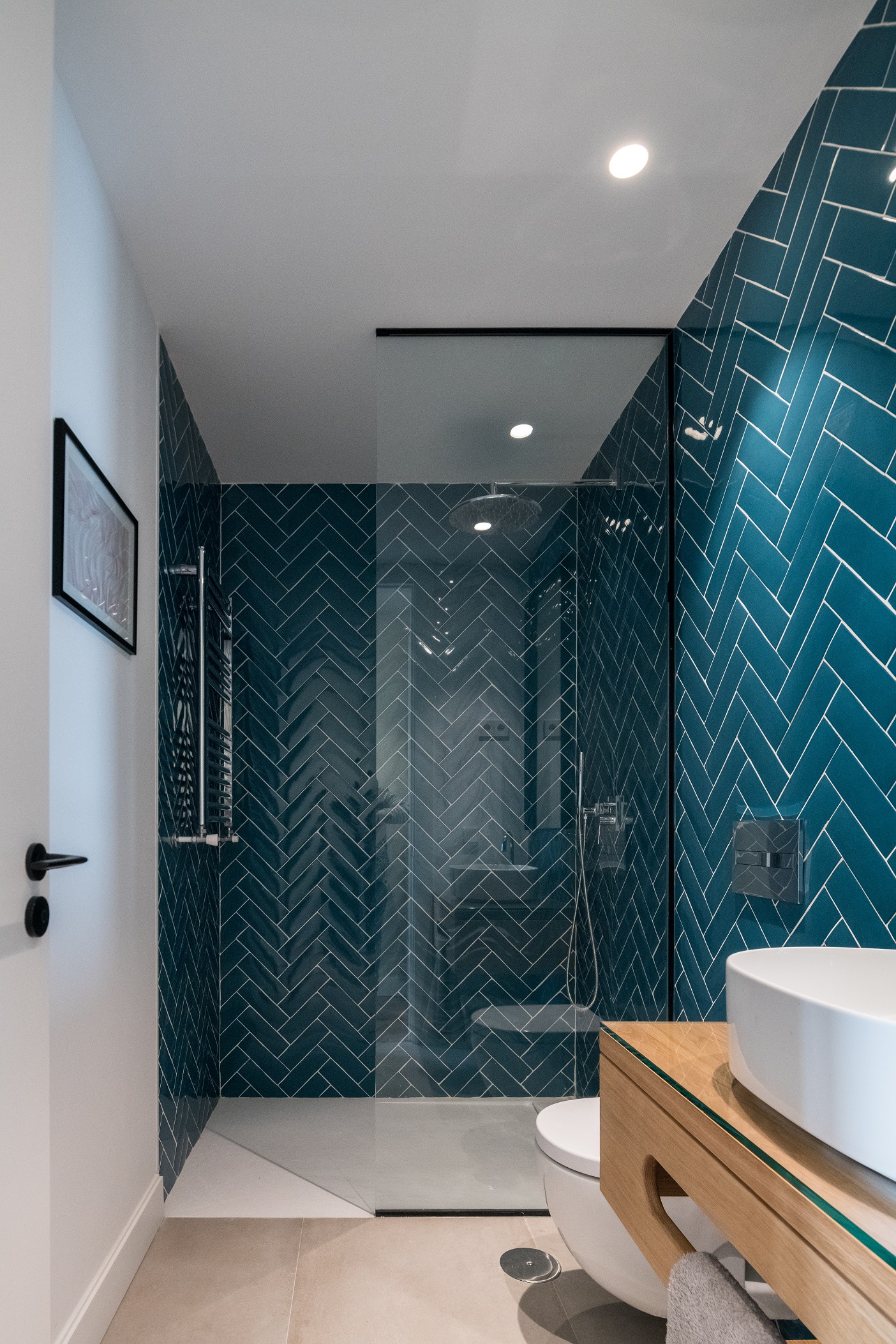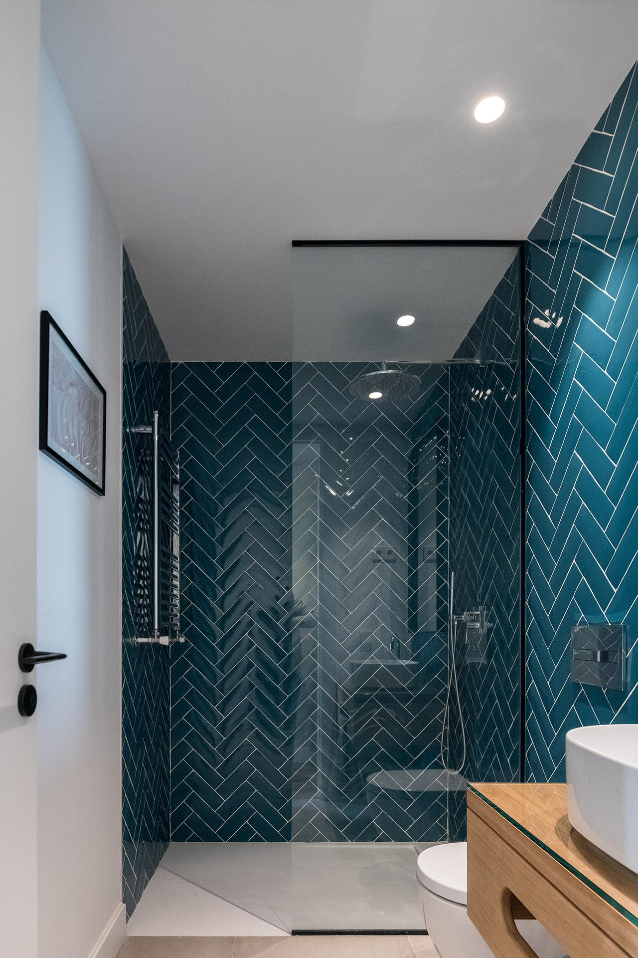 Gracias a la gran calidad de luz natural de la que disponía la vivienda, se pudieron emplear unos tonos medios-oscuros deseados por el Cliente, sin tener que renunciar a una agradable luz ambiental.