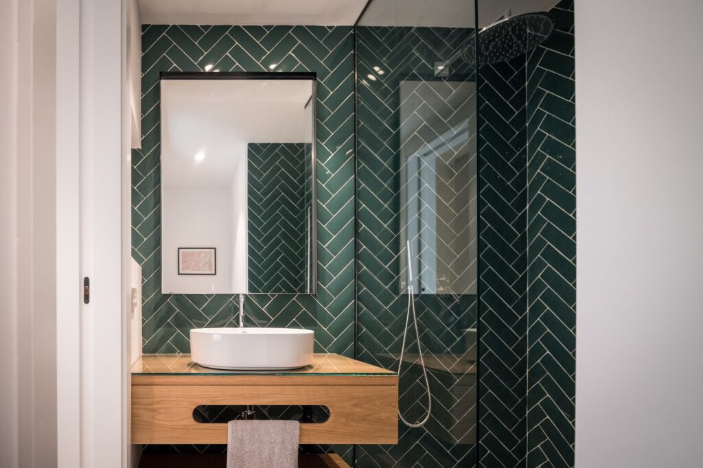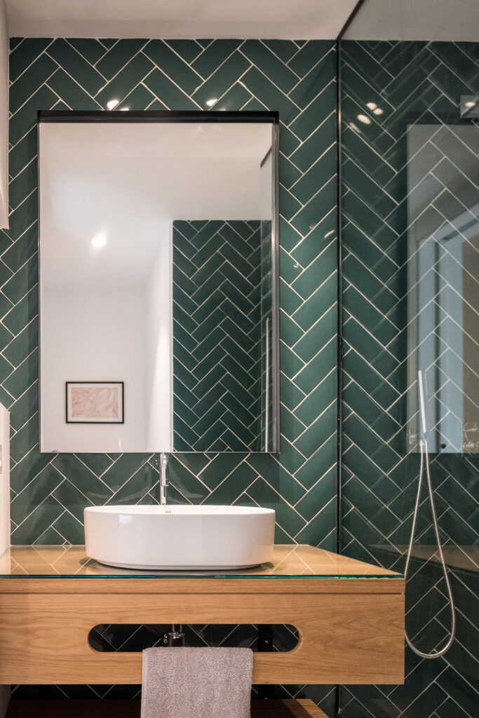 Se decidió optar por un suelo de madera de olmo y un gris marengo en las paredes del salón. Se respetó el tono verde vejiga de las carpinterías exteriores, el cuál debía mantenerse, y se combinó con otros tonos verdes empleados en el resto de revestimientos en zonas húmedas (cocina y baños) dando así continuidad a los elementos preexistentes.