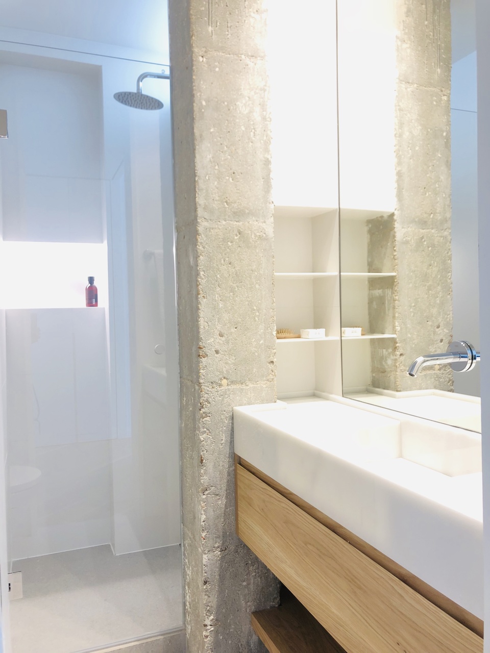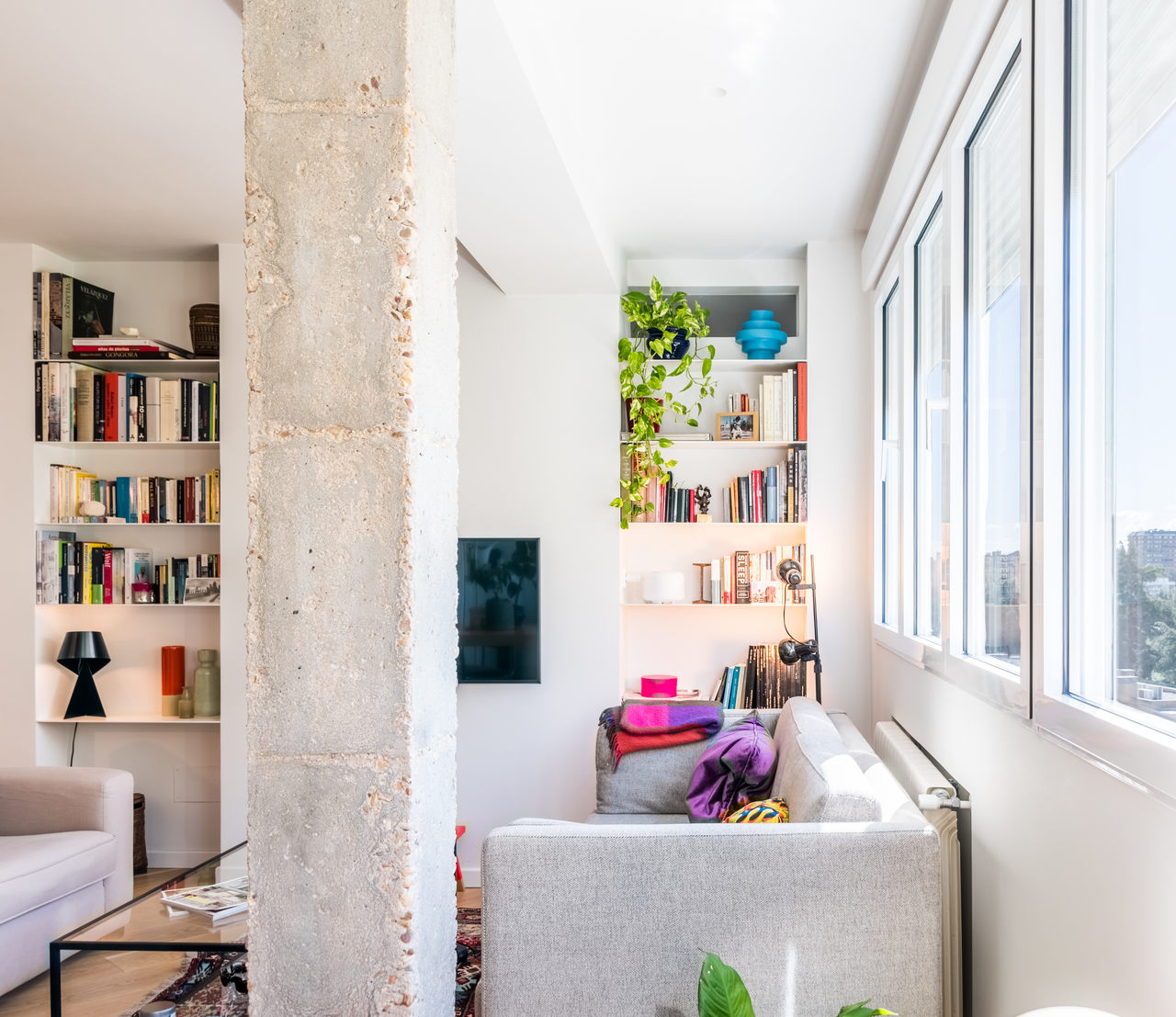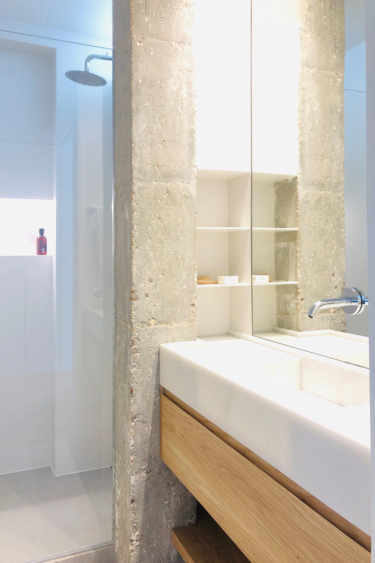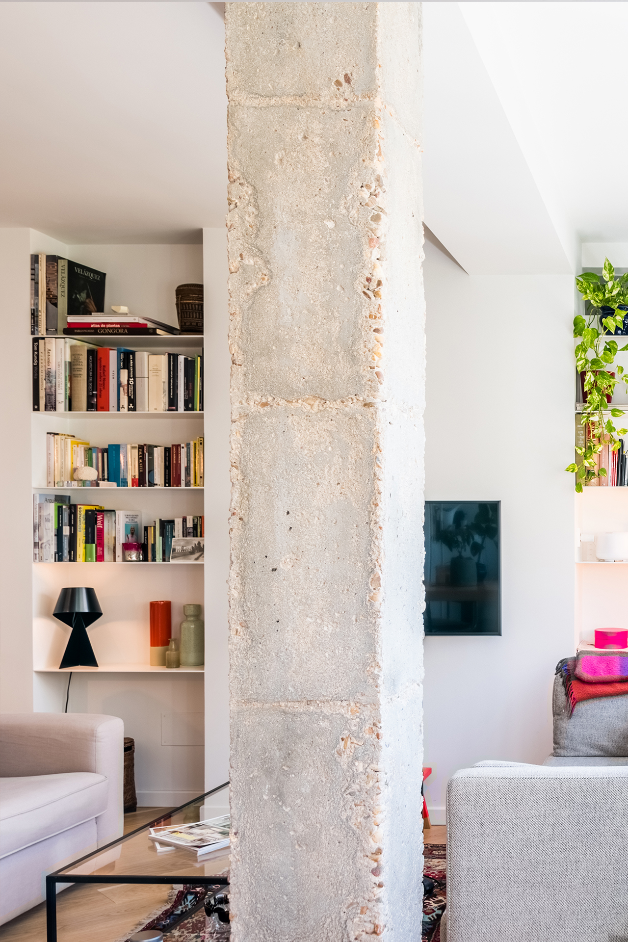 Cabe destacar también la elección de dejar vistos los pilares existentes en hormigón de típica aplicación en las viviendas ejecutadas en Madrid a final de los años 60 el cual, gracias a su tosquedad en los áridos empleados, aporta carácter y personalidad al espacio.
