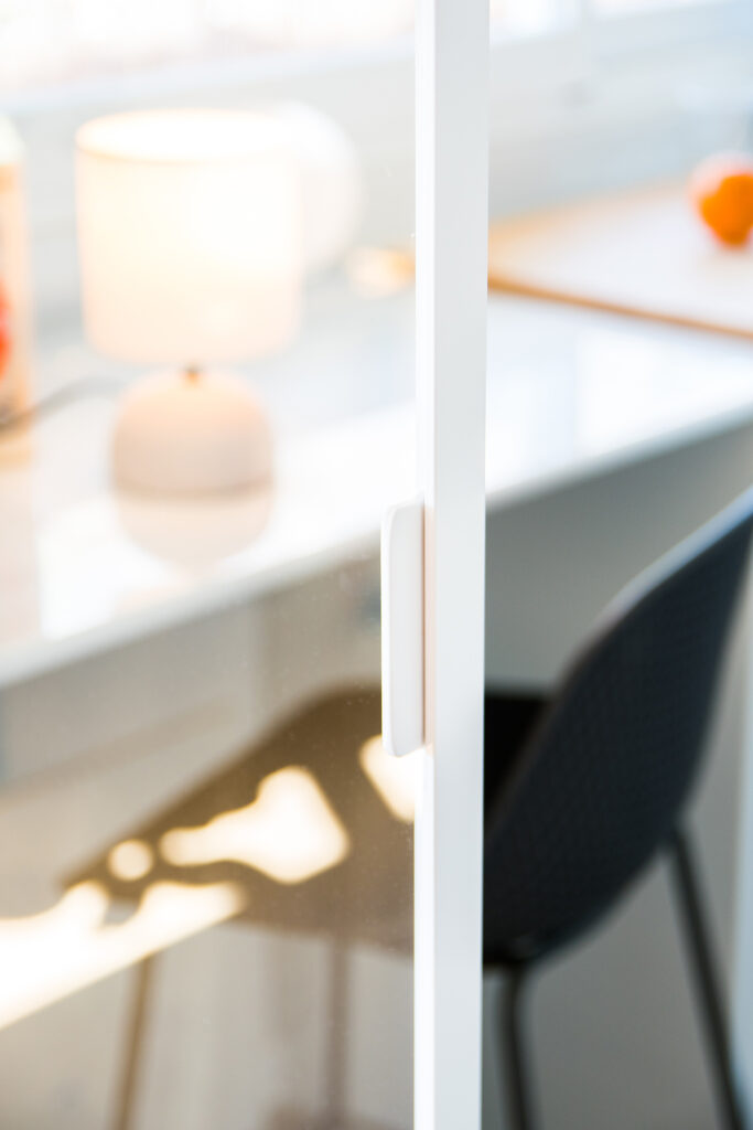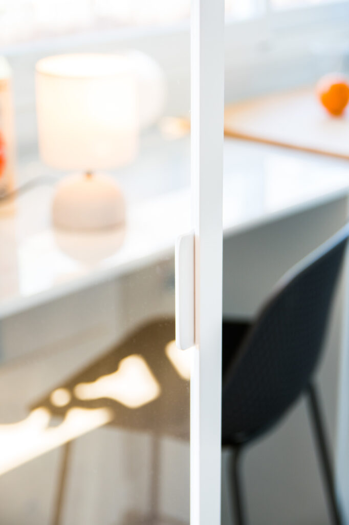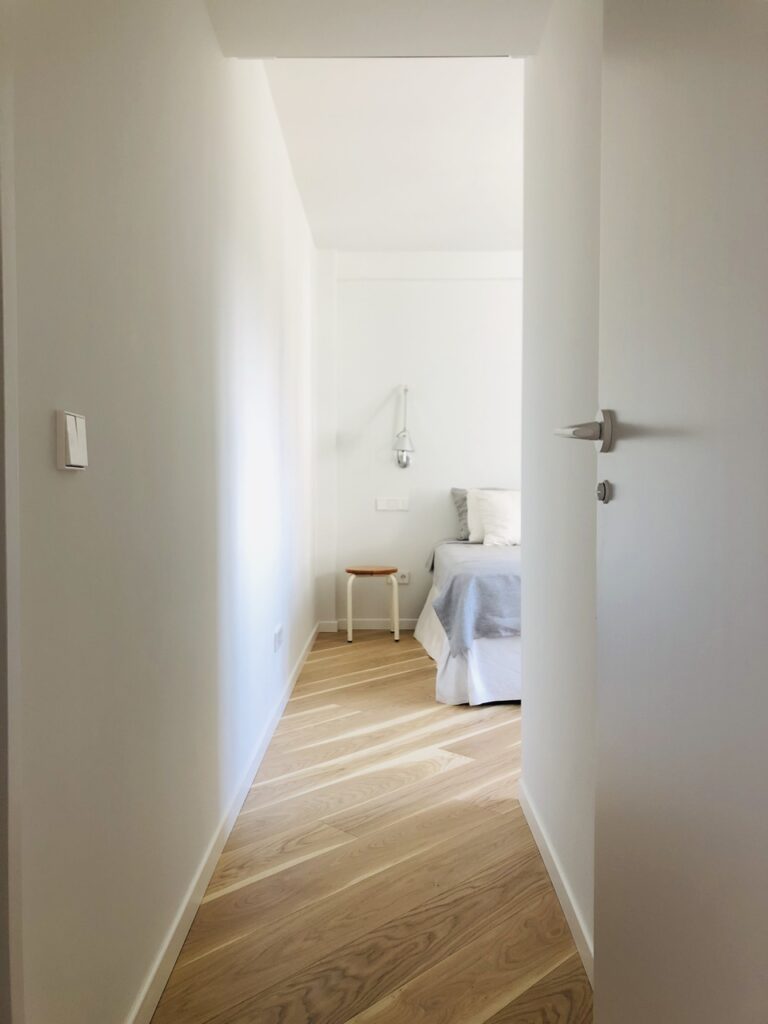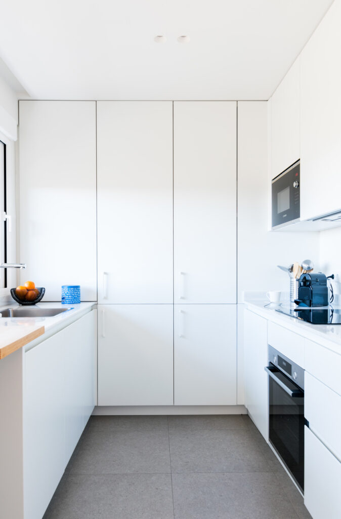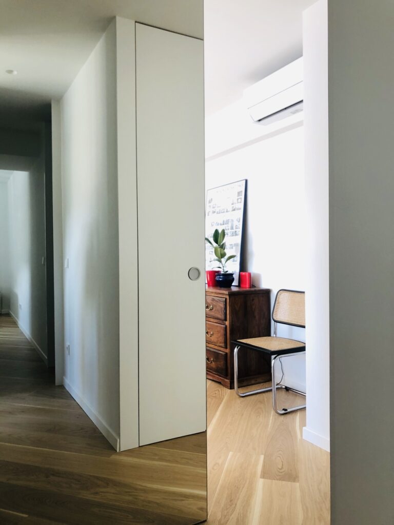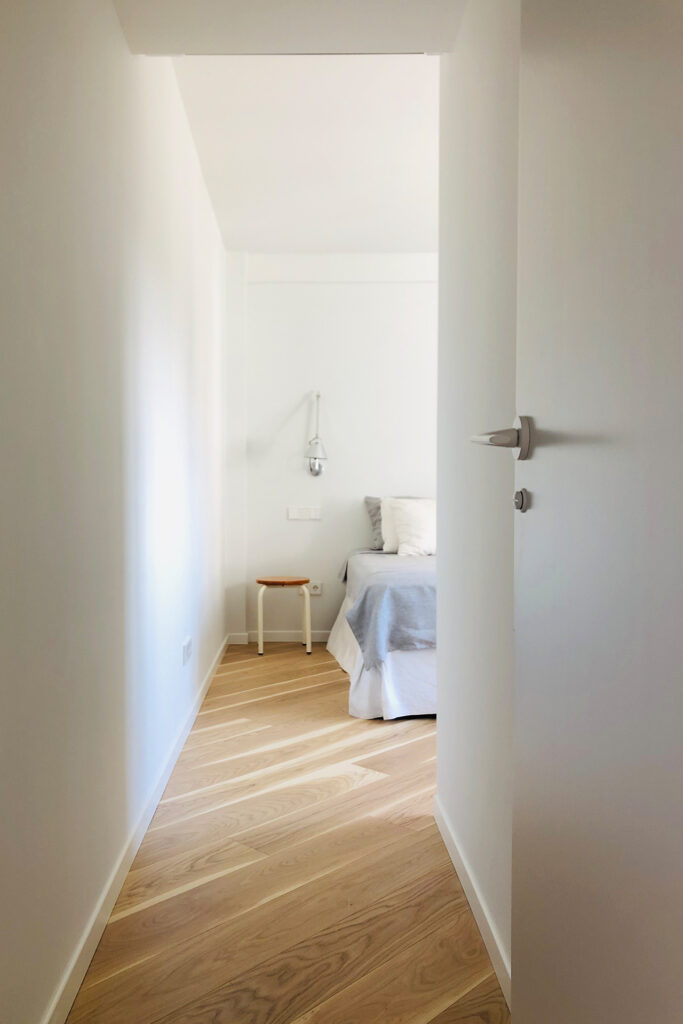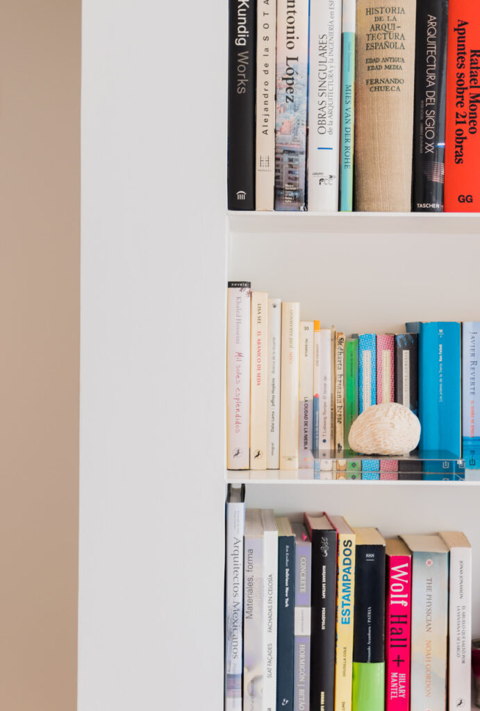 Se escogió un elegante color blanco el cual se empleó en todos los elementos de la vivienda: carpinterías, frentes de armario, mamparas, paramentos verticales y horizontales, tiradores, estanterías, manillas y elementos de cerrajería.