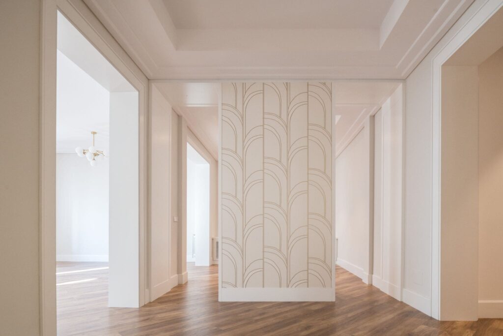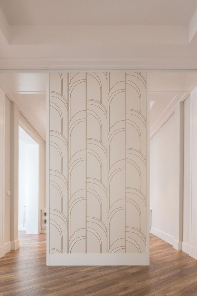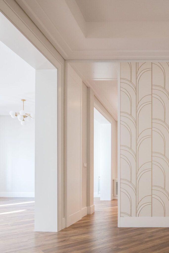 El empleo de una papel textil, las puertas con plafón hasta el techo, un friso cuidadosamente diseñado y una correcta iluminación aportan ritmo y personalidad al largo pasillo vertebrador de la vivienda.