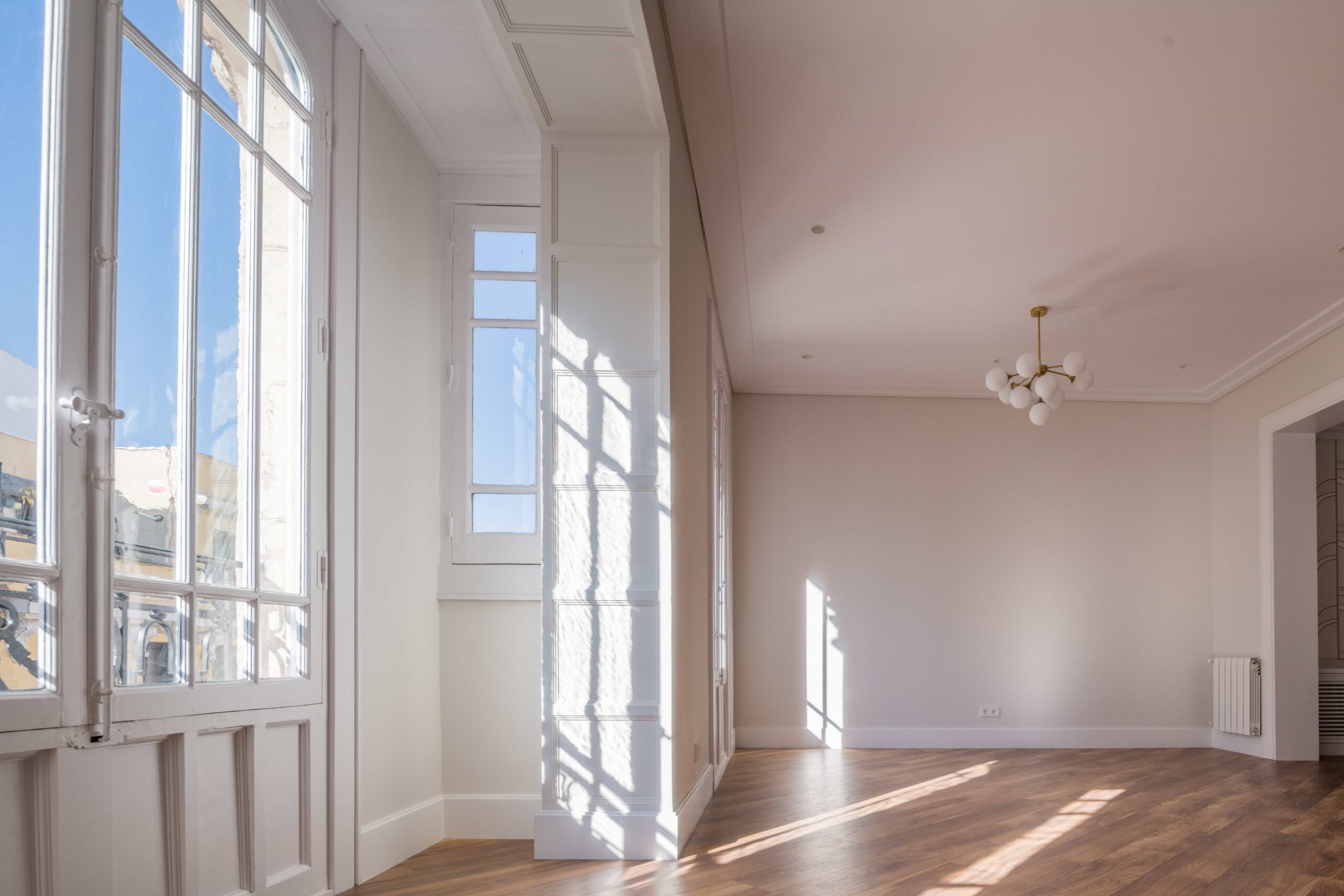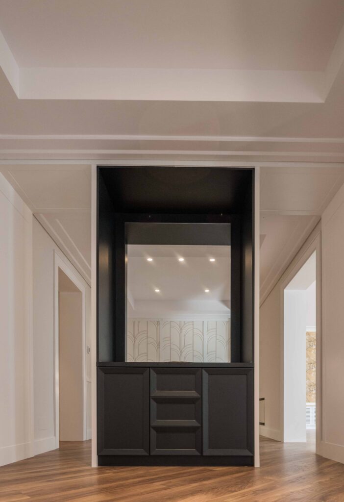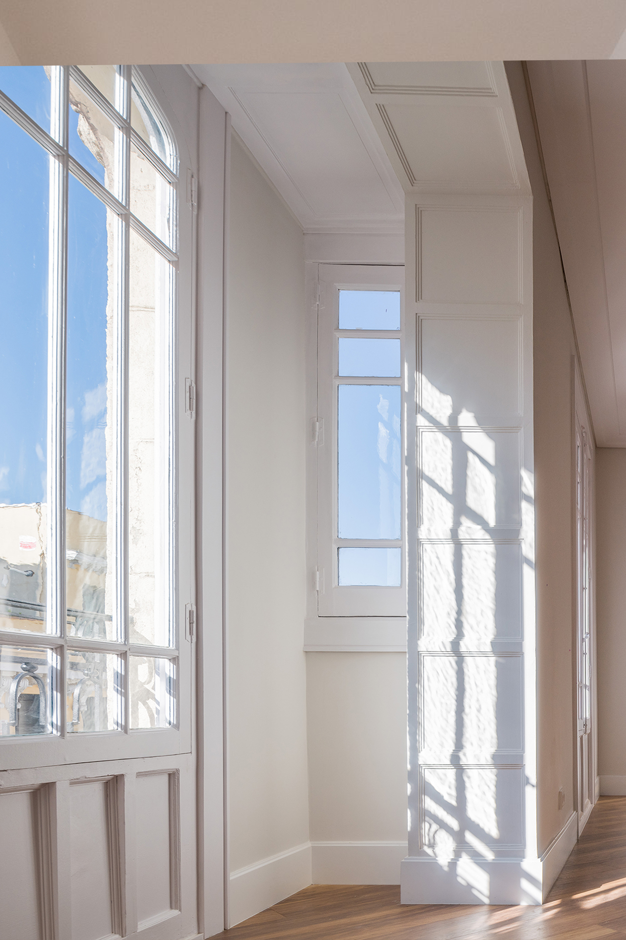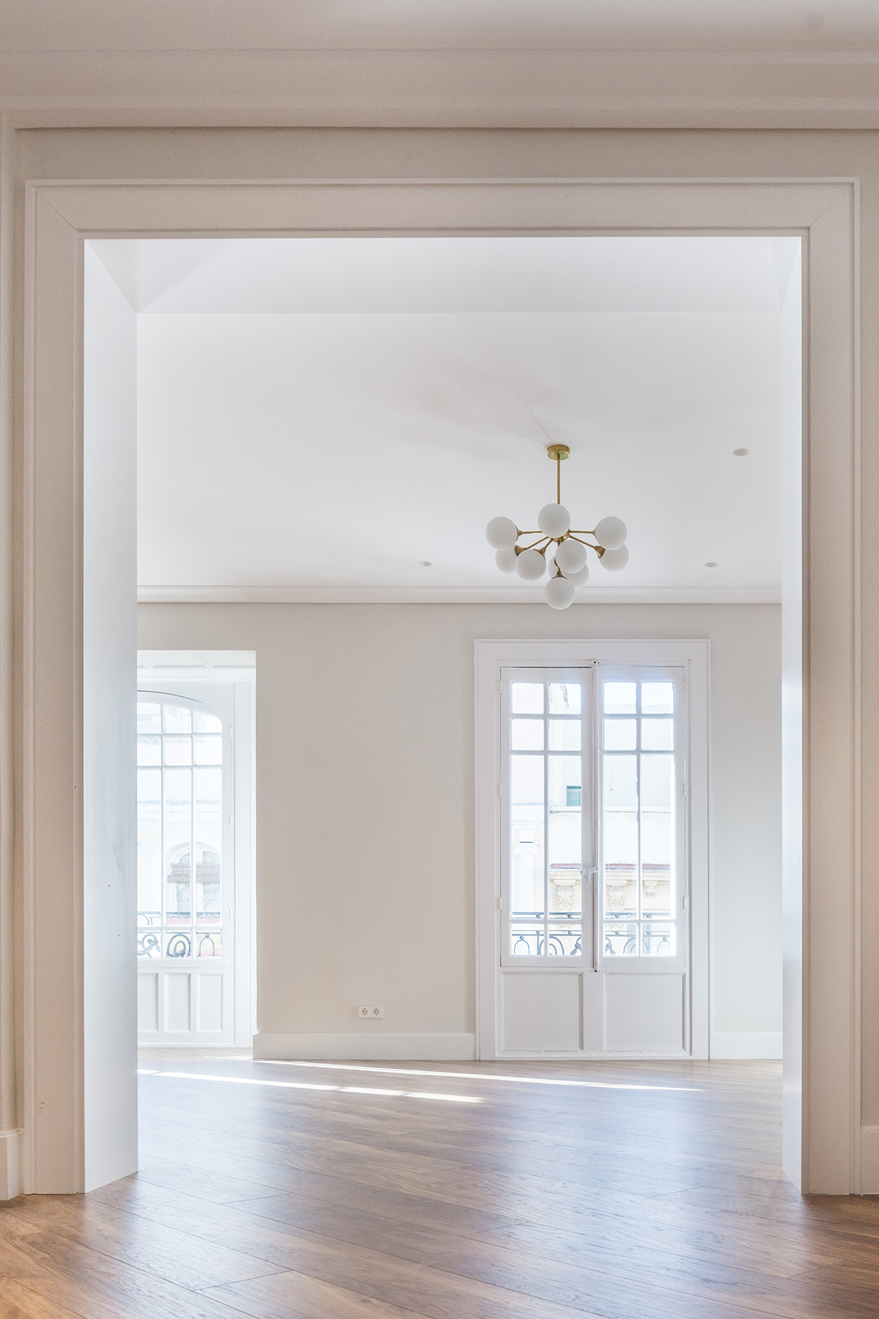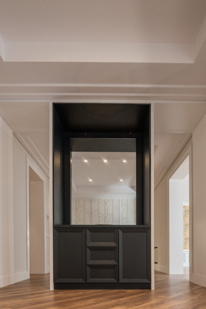 La reforma integral de esta vivienda viene marcada por el respeto de las elegantes ventanas de un imponente edificio en el barrio de Salamanca así como por el empleo de numerosos elementos de ebanistería cuidadosamente diseñados y distribuidos a lo largo de todas las estancias de la casa.