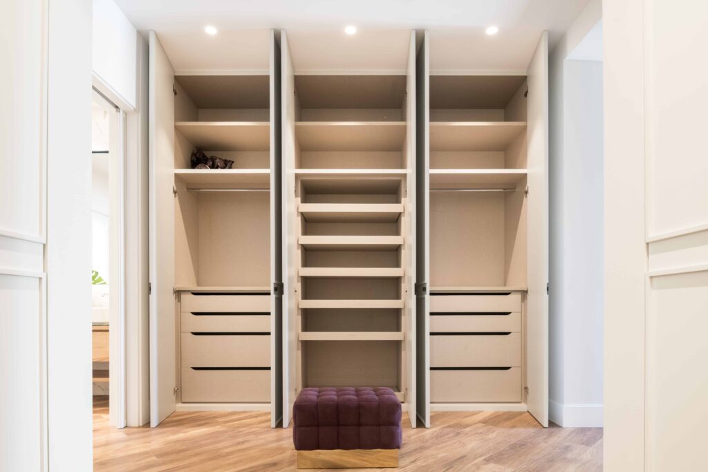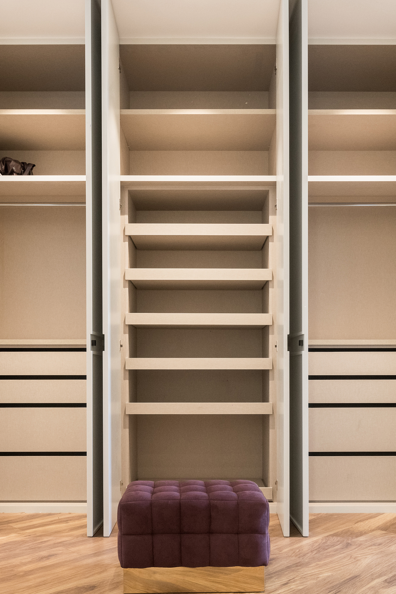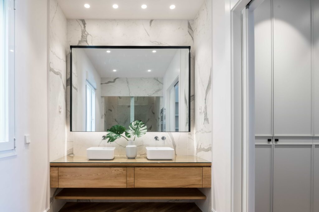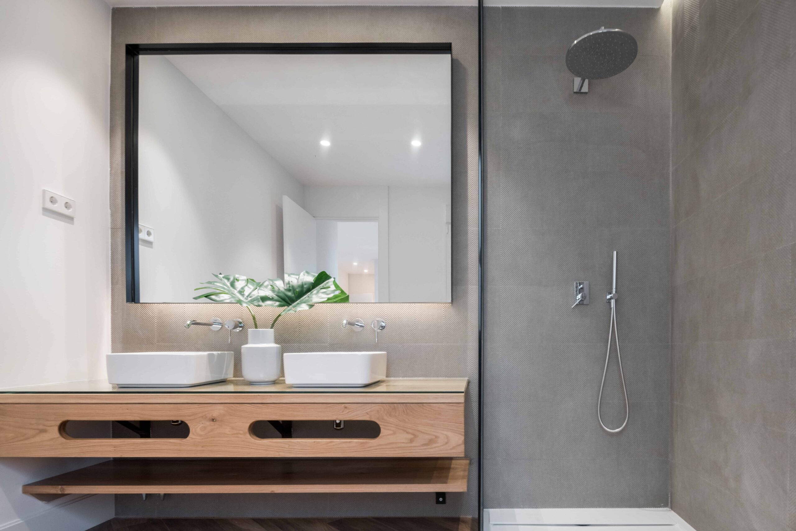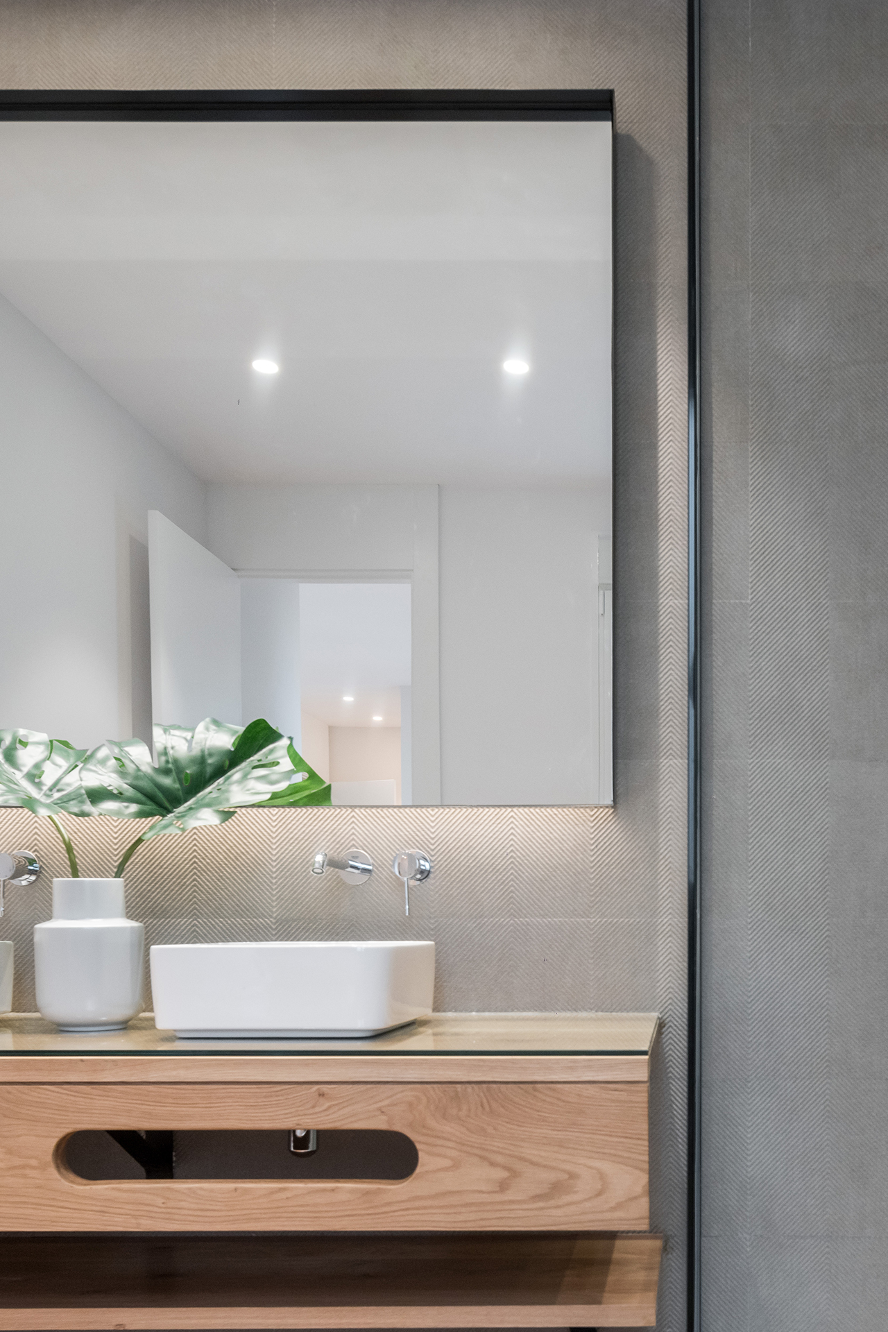 El dormitorio principal alberga un gran vestidor con armarios lacados diseñados a medida en tonos gris cielo y un baño en suite donde se combina el porcelánico de gran formato y la madera natural en el mueble del lavabo.