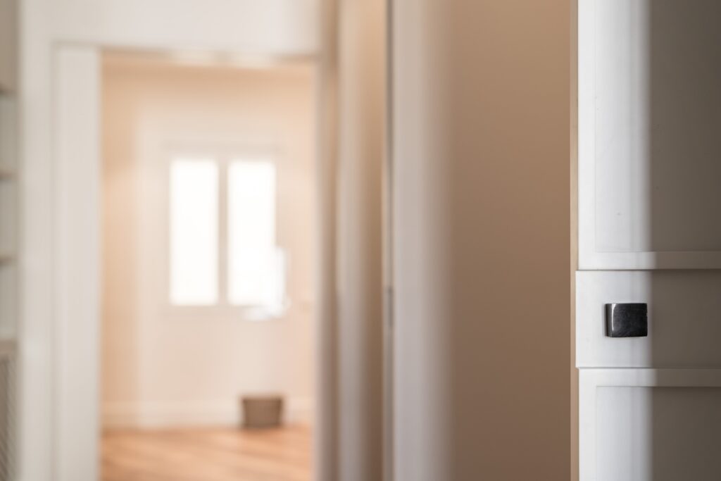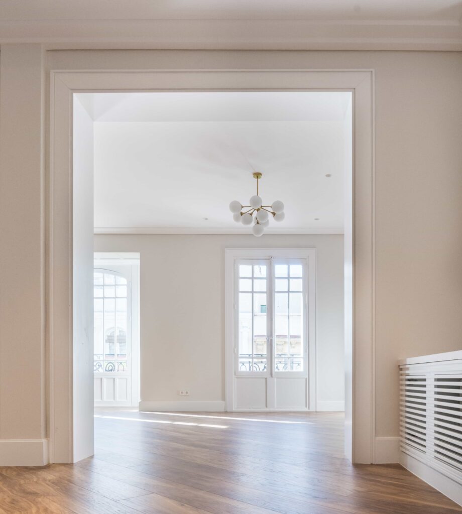 Todas las estancias de las zonas nobles quedan comunicada a través de huecos revestidos por embocaduras en madera lacada en blanco.