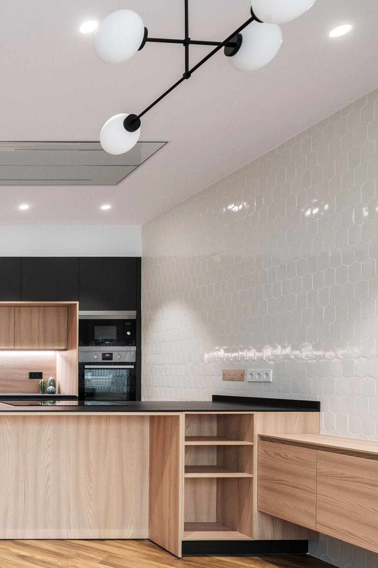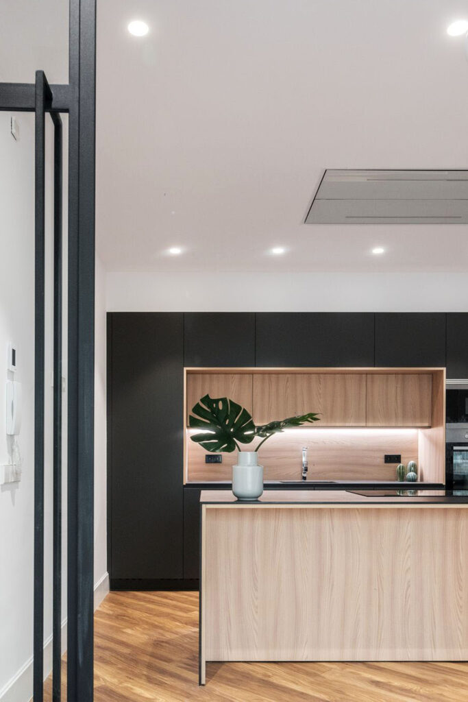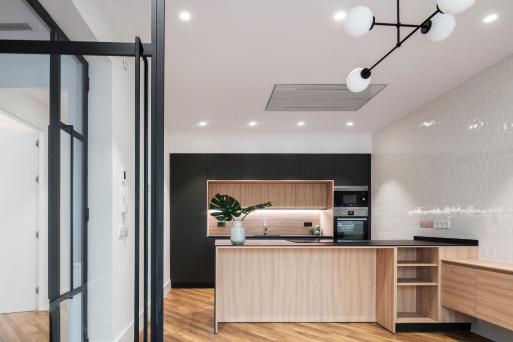 La cocina, vanguardista, en tonos negros y madera se combinan con el empleo de un bonito alicatado crema en forma de lágrima y un cerramiento metálico negro con paños de vidrio transparente.