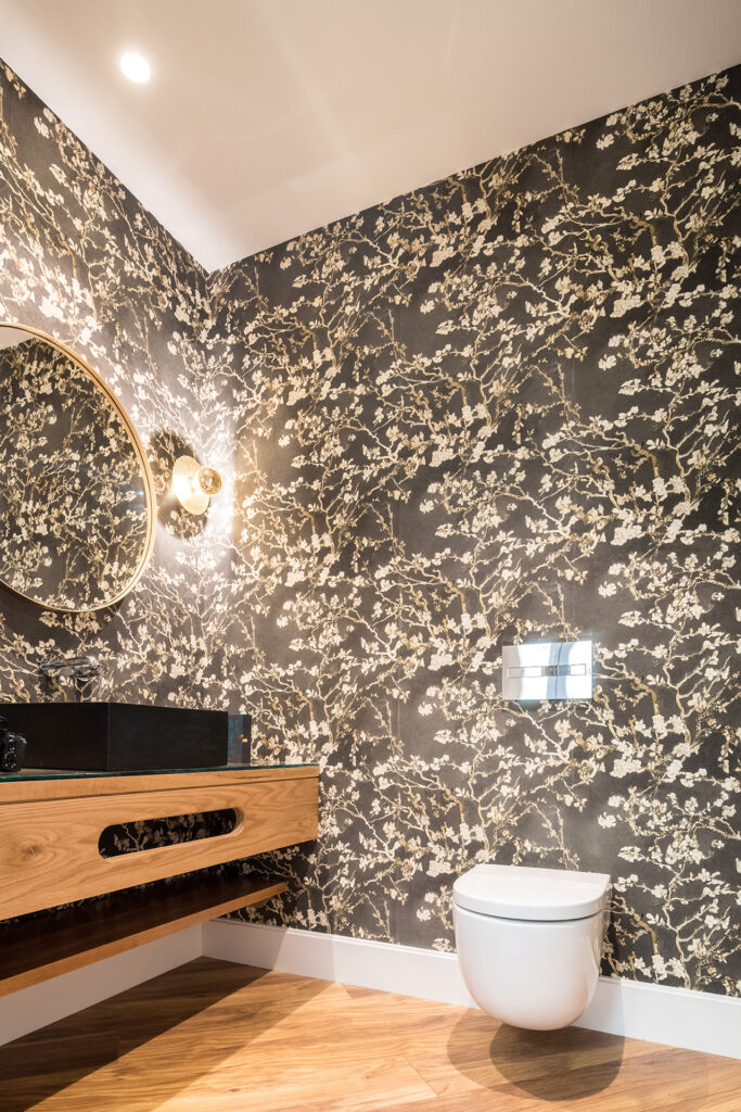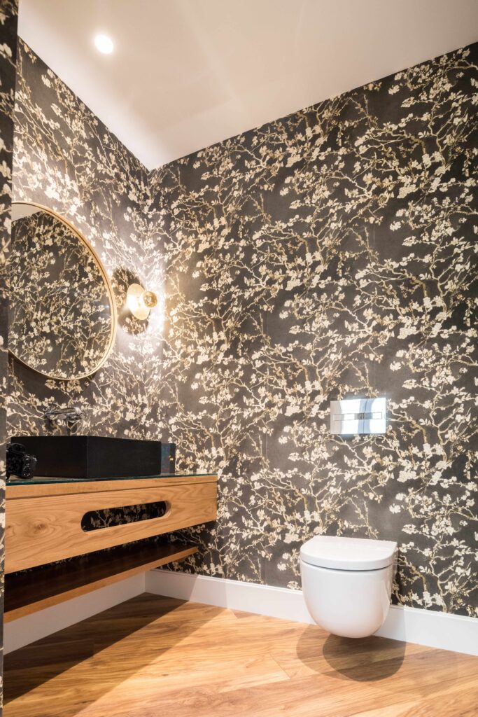 En el vestíbulo, cabe destacar la doble funcionalidad del mueble recibidor, que por un lado sirve de muro divisorio y proporciona un majestuoso paño cubierto por un decorativo papel, y por el otro, es un mueble bar integrado en el espacio de despacho.