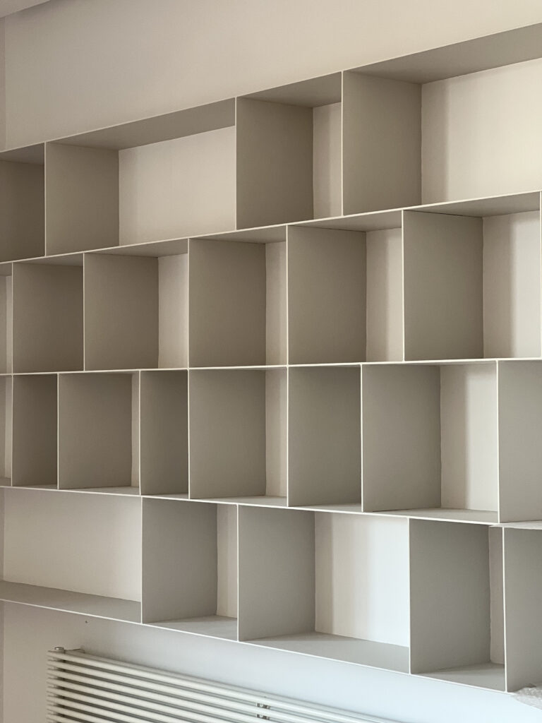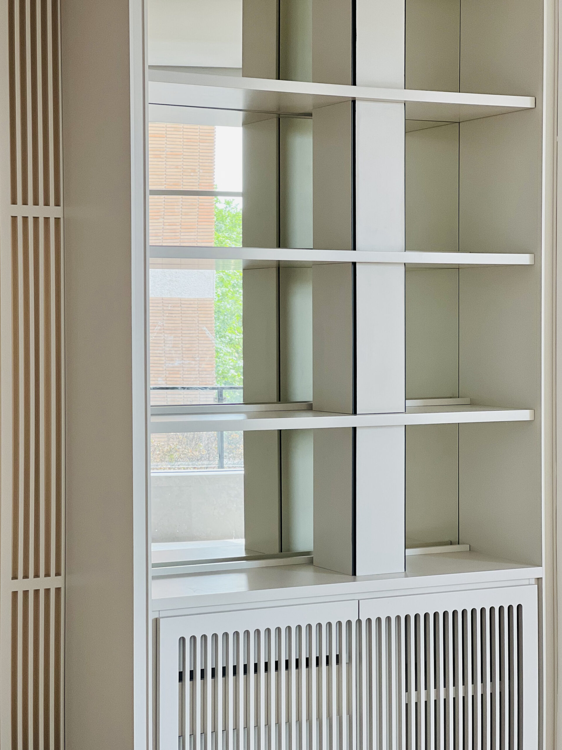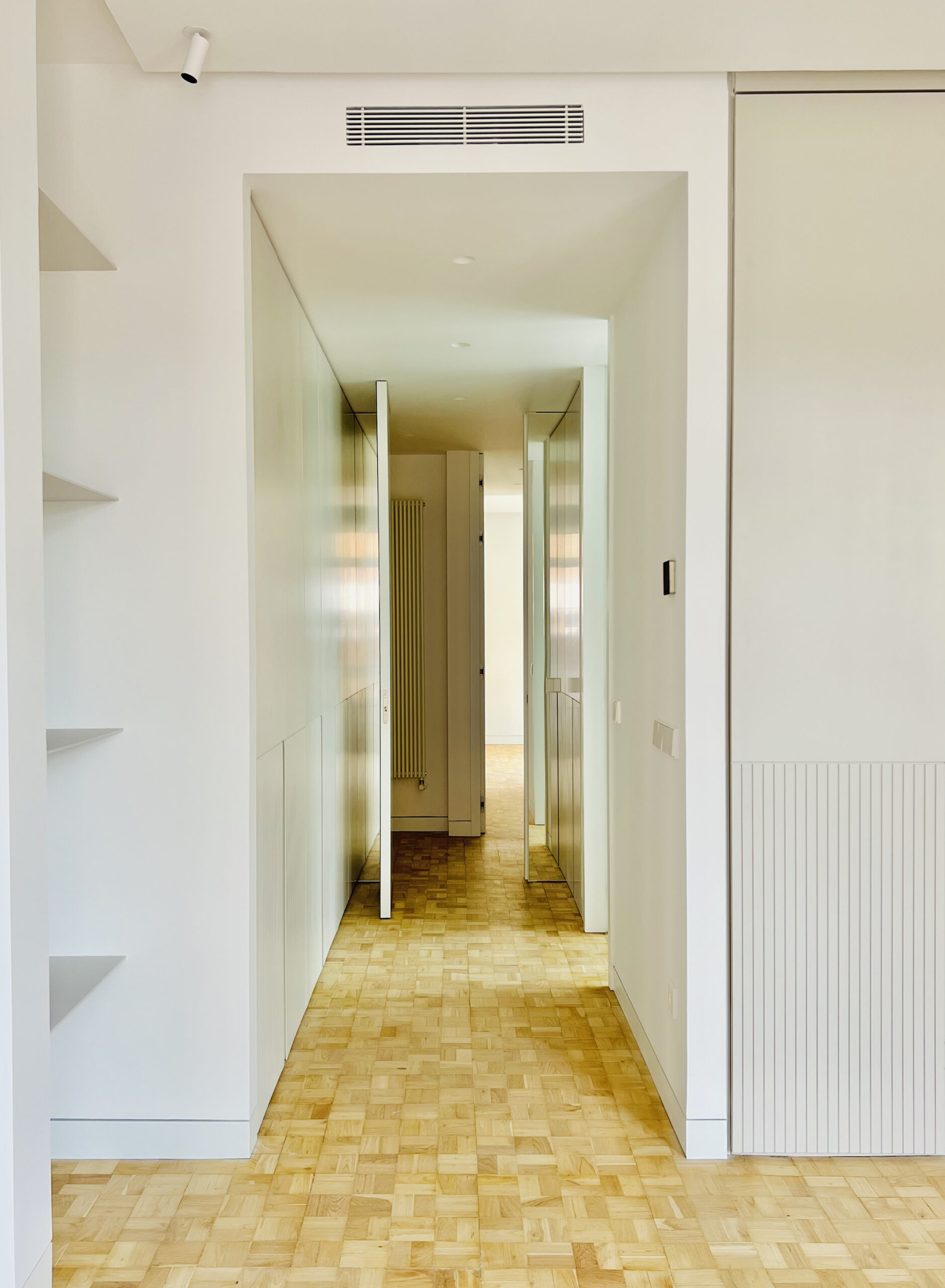 El diseño a medida de un frente de armarios- estantería en caras opuestas vertebran el vestíbulo y el salón. Funcionalidad y almacenamiento al servicio del espacio. A través de un pórtico central con unas elegantes puertas correderas se comunican ambos espacios.