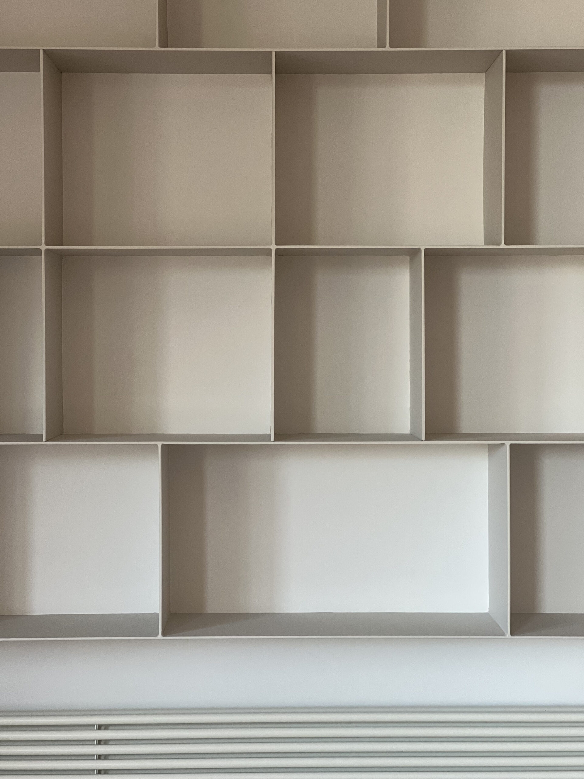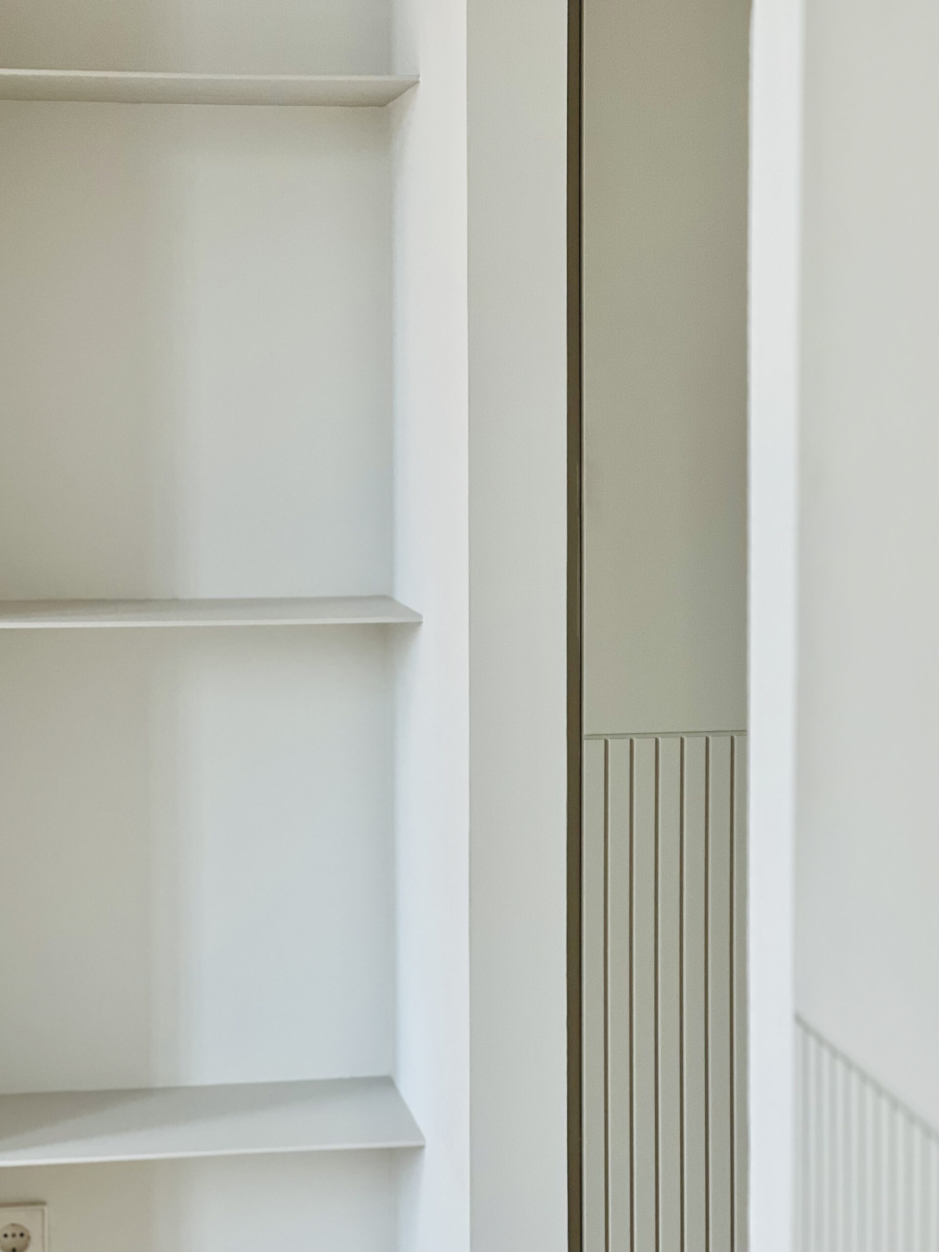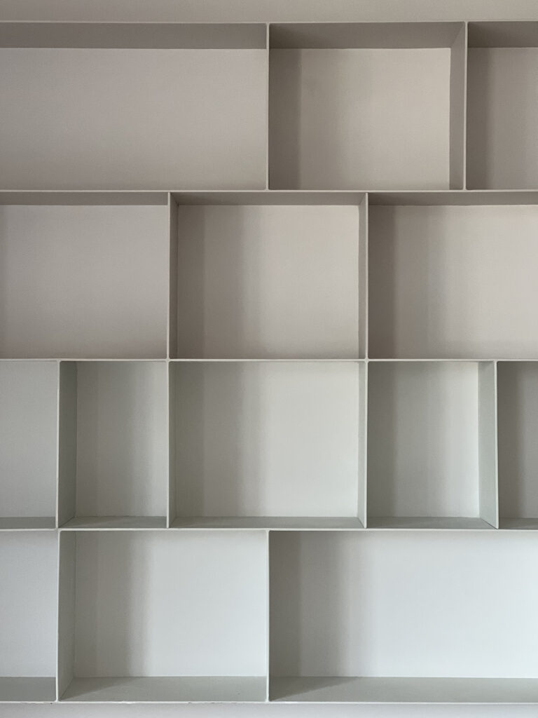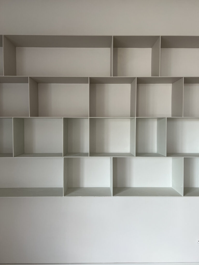 El diseño a medida de un frente de armarios- estantería en caras opuestas vertebran el vestíbulo y el salón. Funcionalidad y almacenamiento al servicio del espacio. A través de un pórtico central con unas elegantes puertas correderas se comunican ambos espacios.