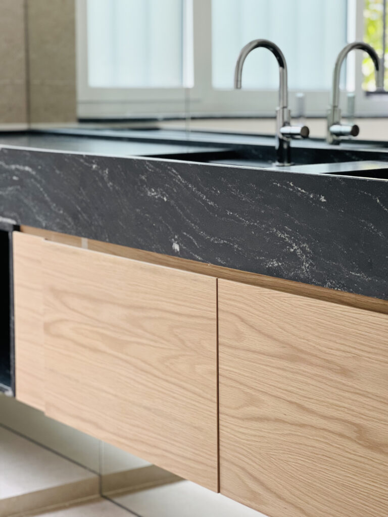 En el vestíbulo, la cocina y en los baños se combina la piedra natural con alicatados y solados neutros y acentuados que dotan a los espacios de un carácter con tintes art-decó.