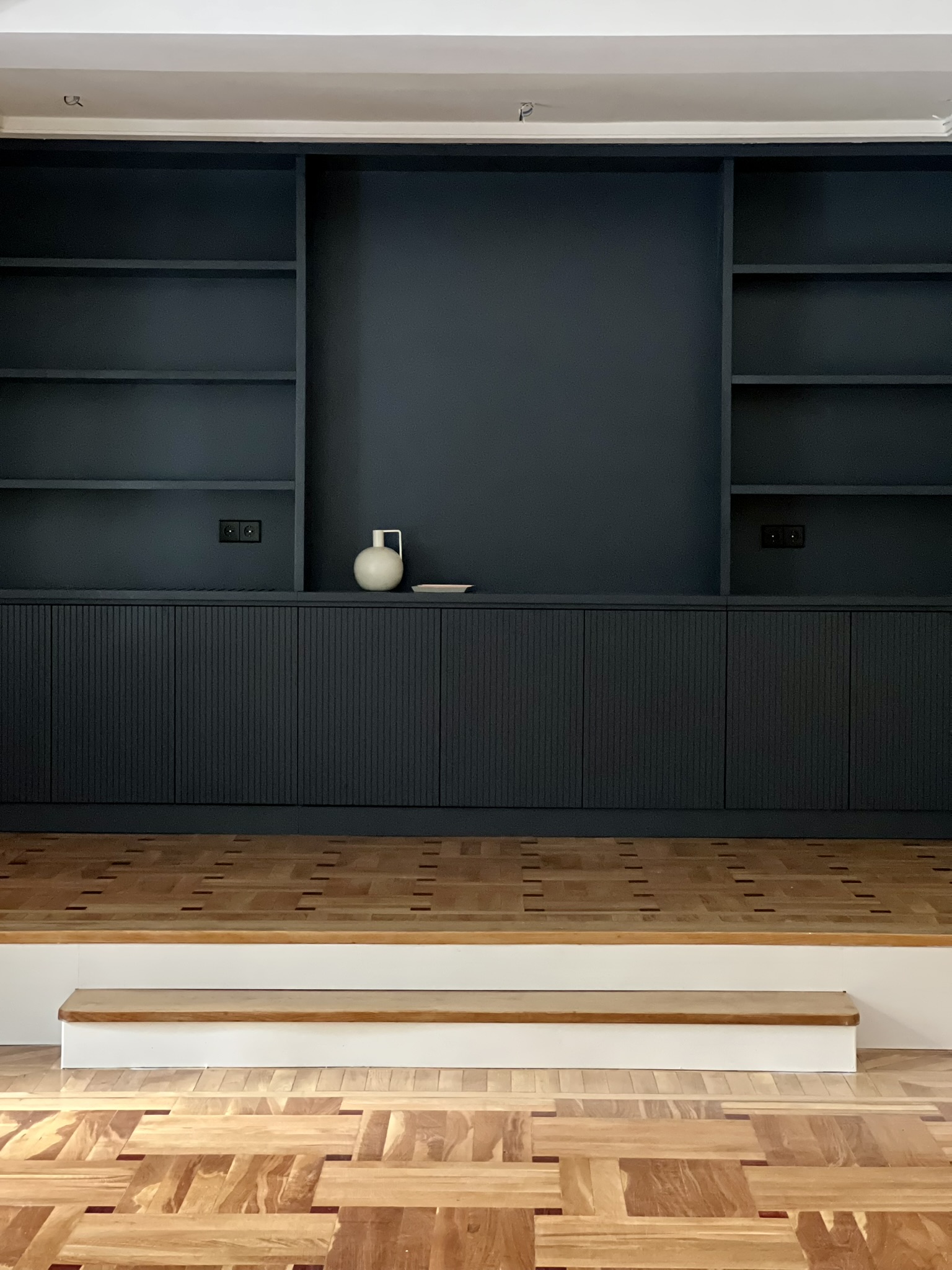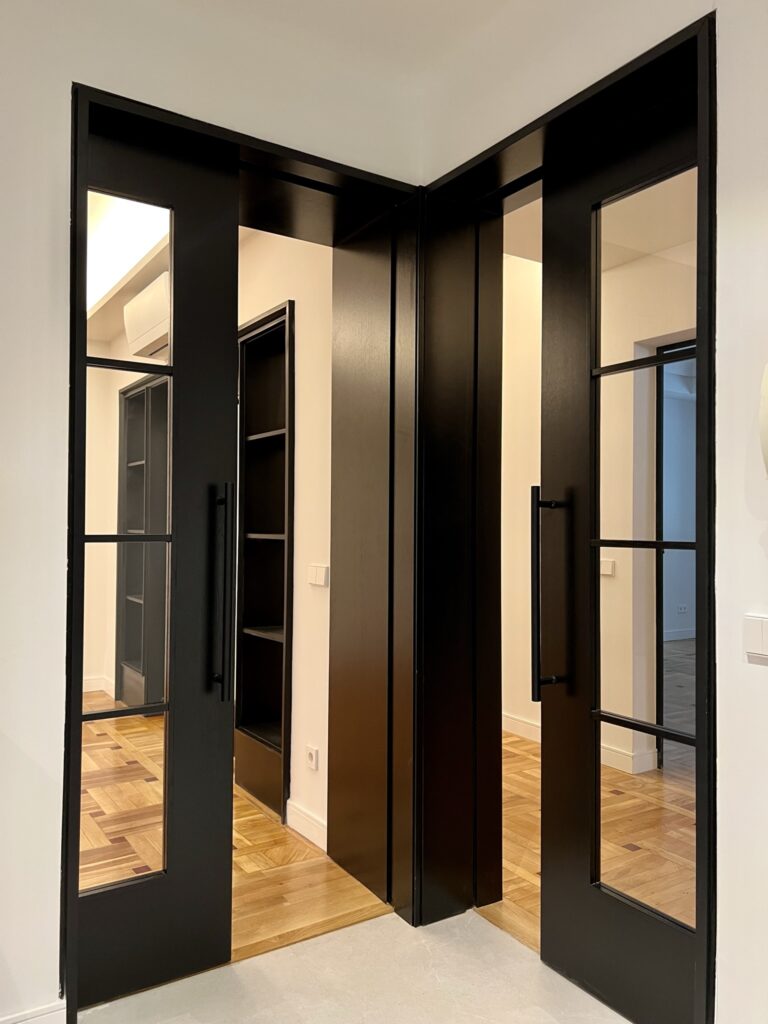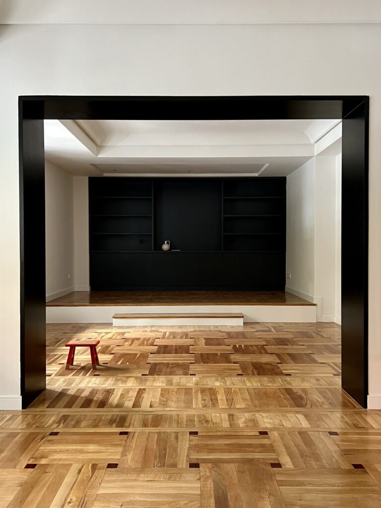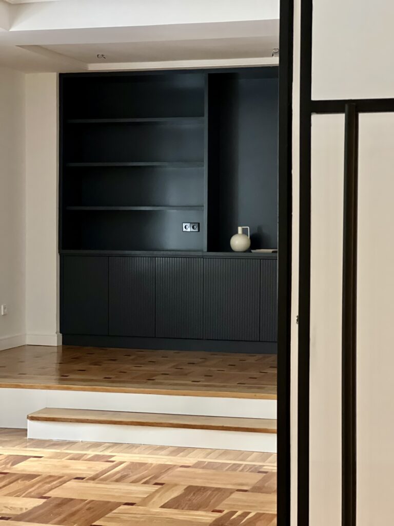Para los mueles de ebanistería, escogimos el roble tintado y el DM lacado en negro. Diseñamos con mimo todos los elementos de la vivienda: cocina, encimeras de baños, cajoneras, puertas y embocaduras, librería… para garantizar una armonía y equilibrio en todos los elementos que componen la vivienda.