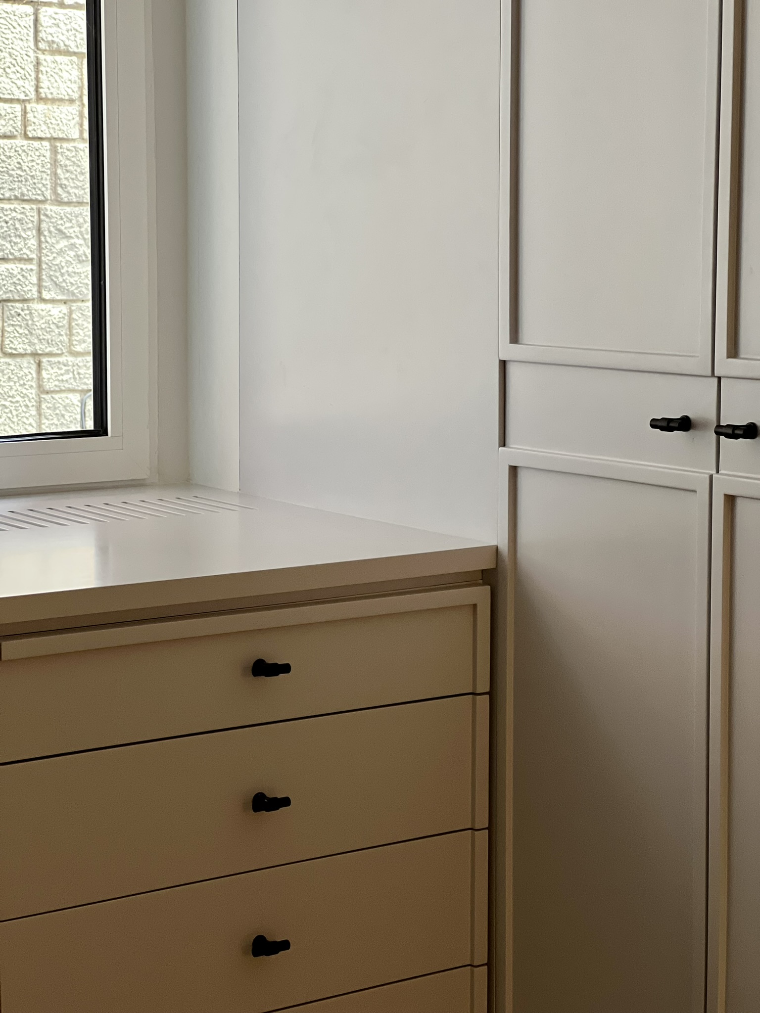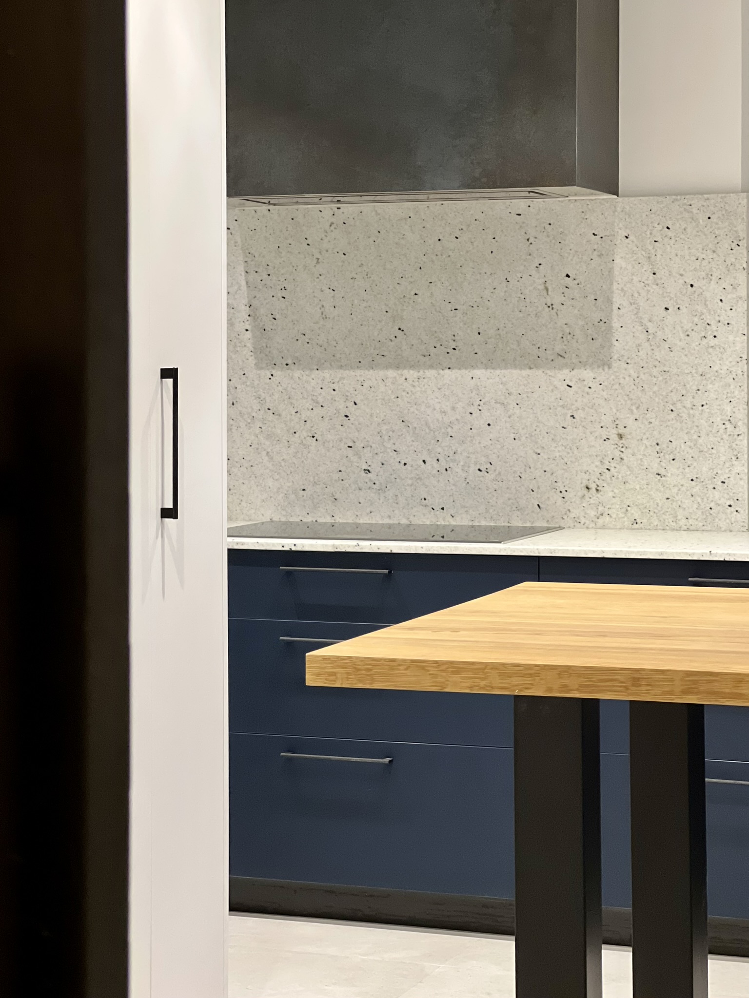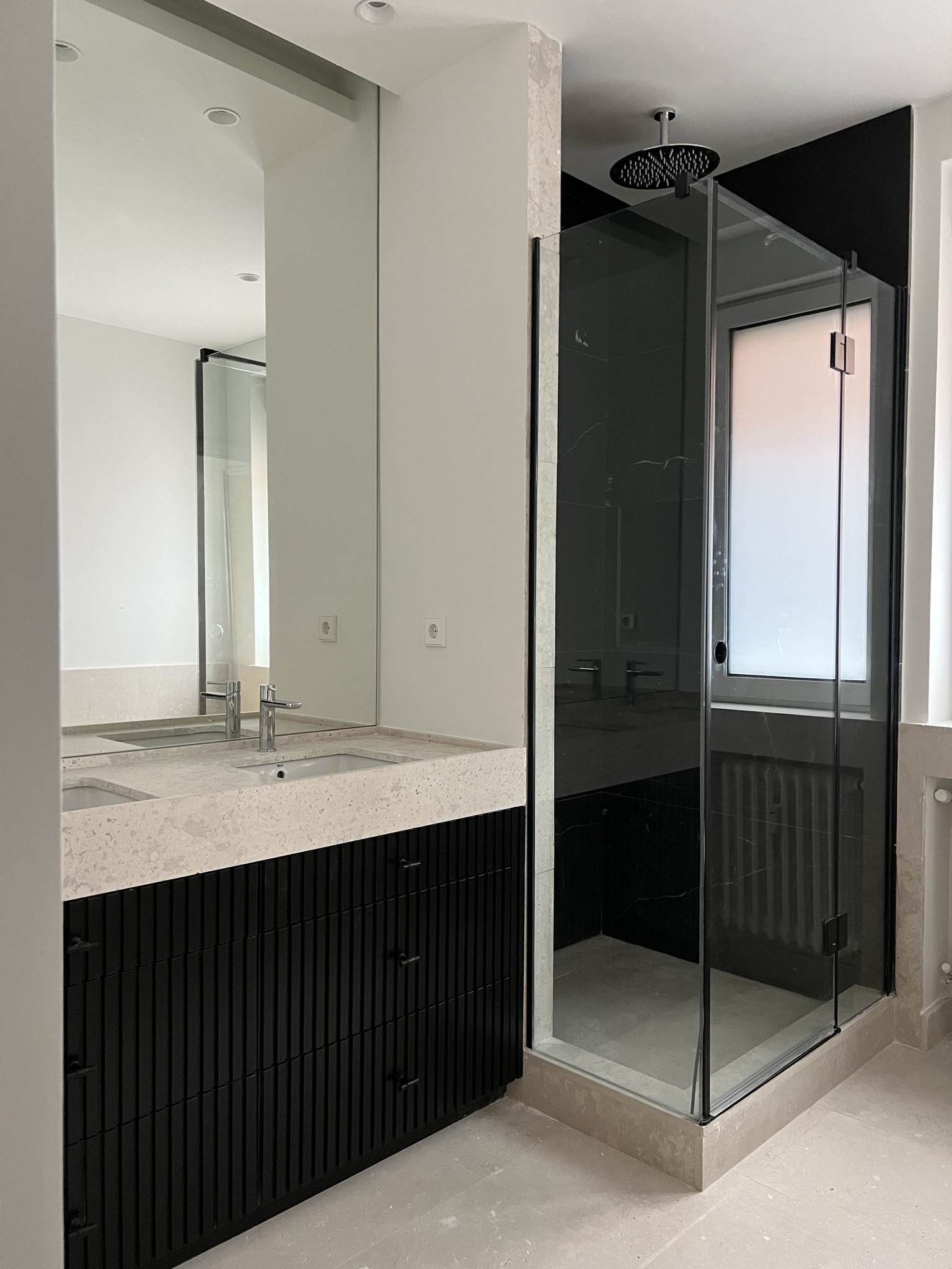 Para los mueles de ebanistería, escogimos el roble tintado y el DM lacado en negro. Diseñamos con mimo todos los elementos de la vivienda: cocina, encimeras de baños, cajoneras, puertas y embocaduras, librería… para garantizar una armonía y equilibrio en todos los elementos que componen la vivienda.