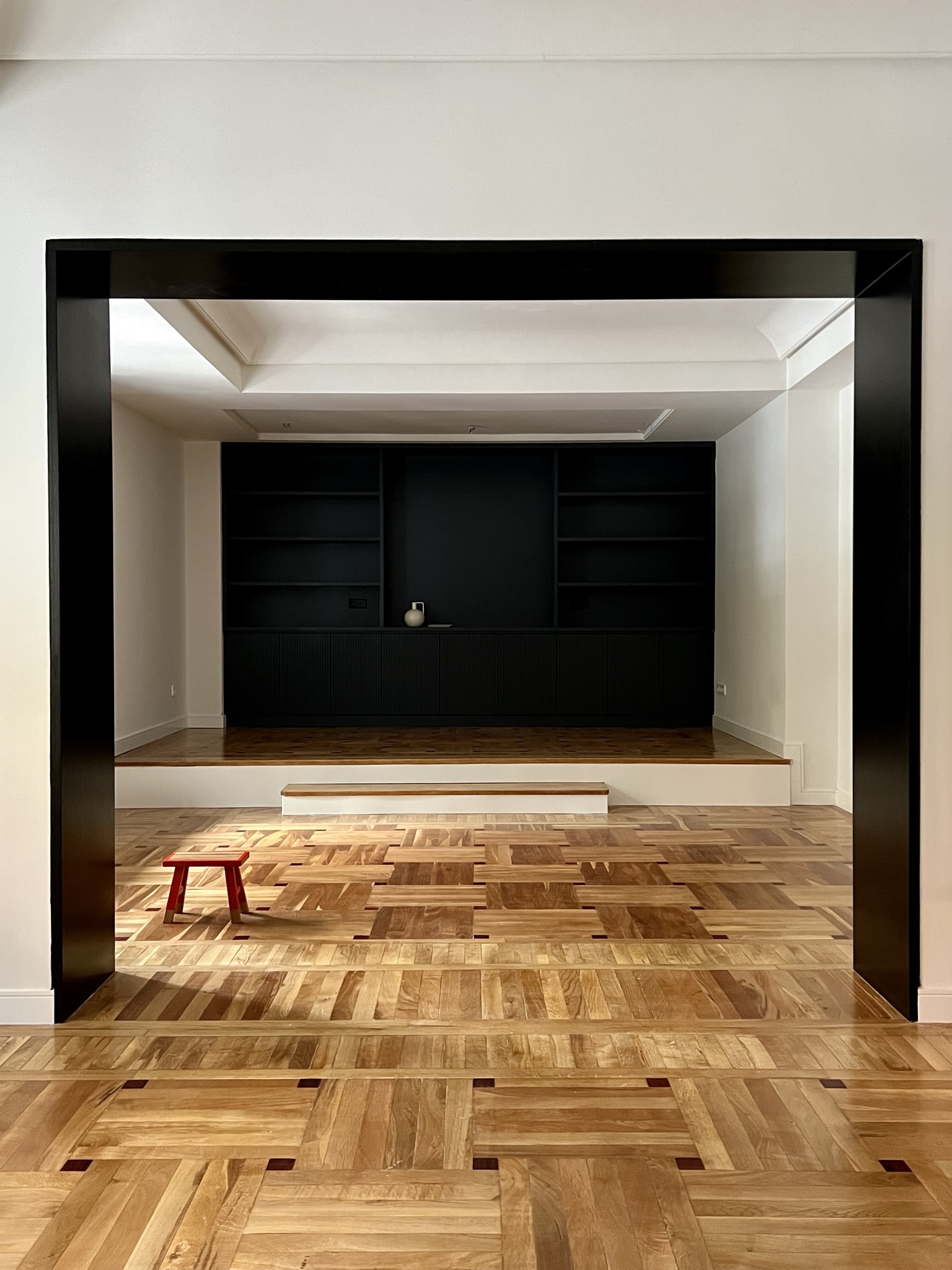 Consideramos que el empleo de los colores blanco y negro combinados con el suelo de madera existente generarían un ambiente señorial y elegante.