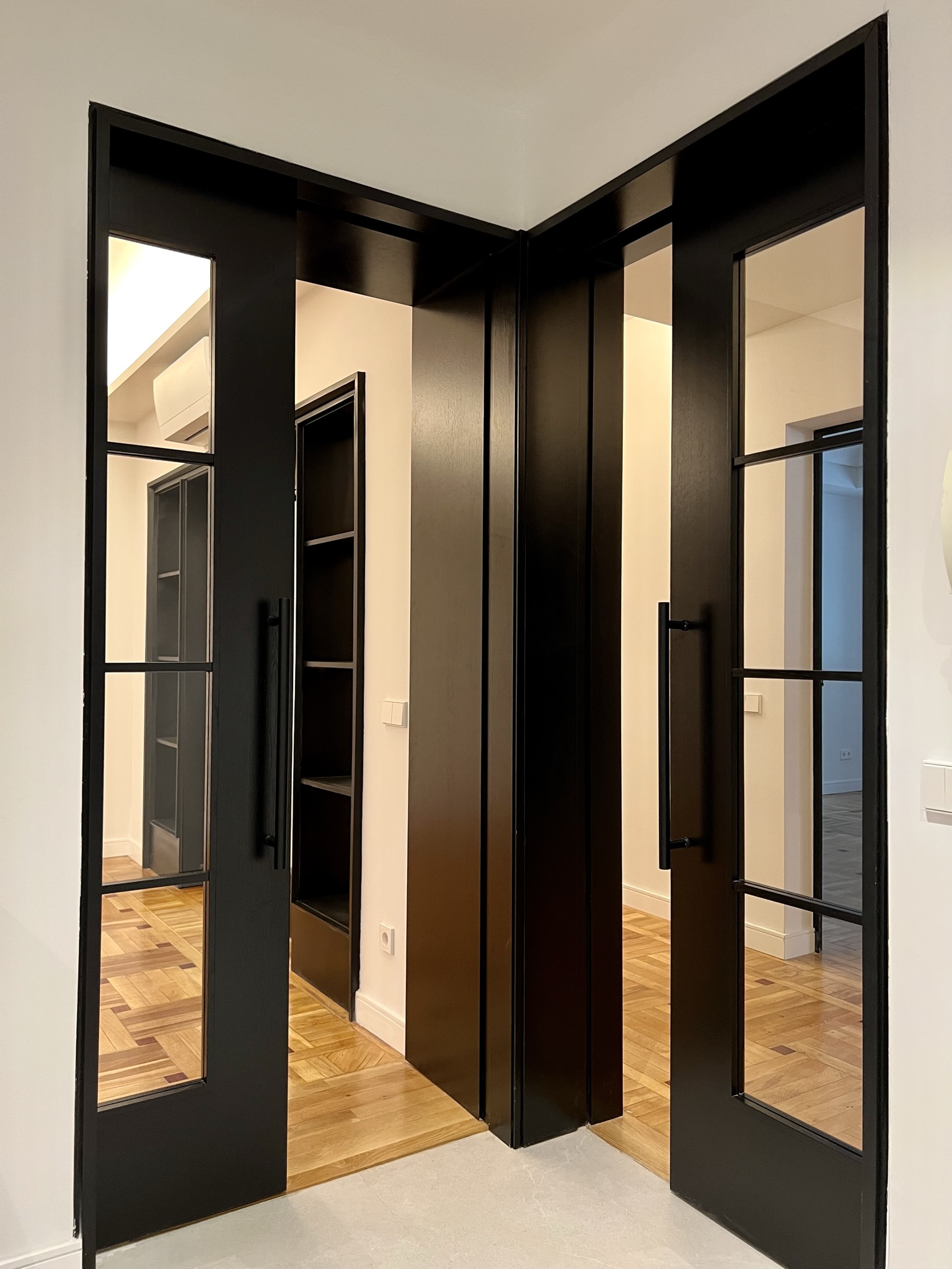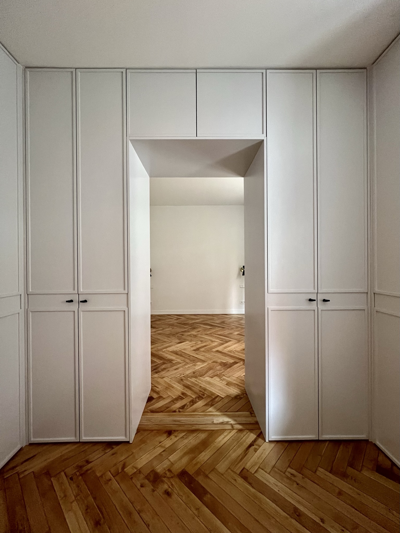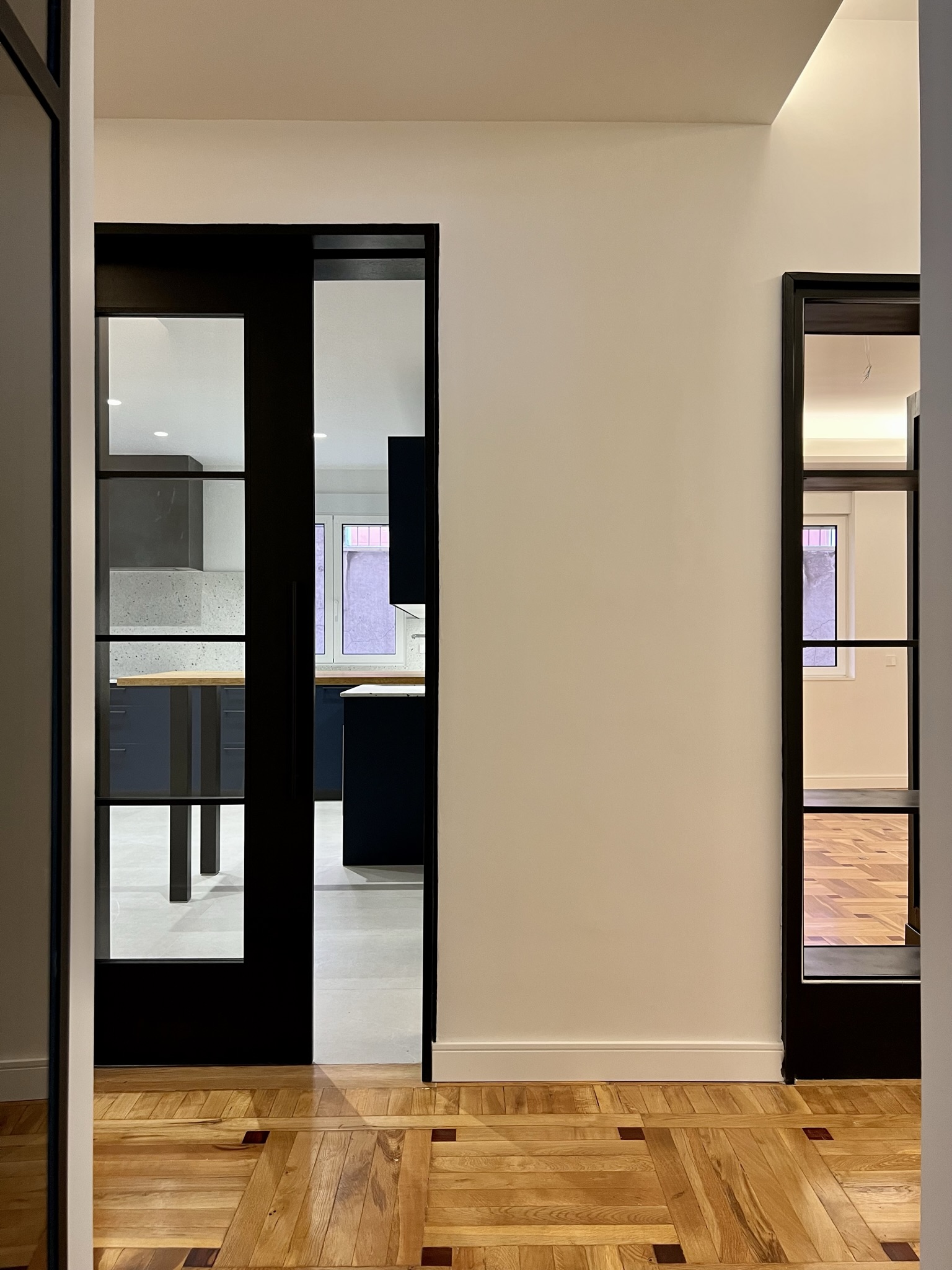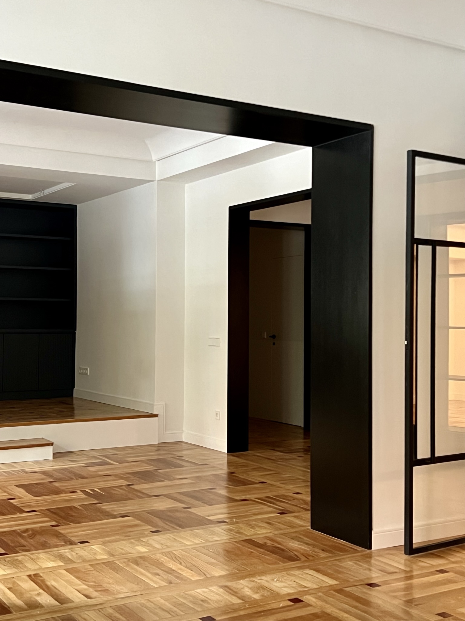 Remarcamos los pasos entre las diferentes estancias con embocaduras de roble natural tintado en negro. De esta manera conseguimos delimitar los espacios a la vez que los conectábamos.