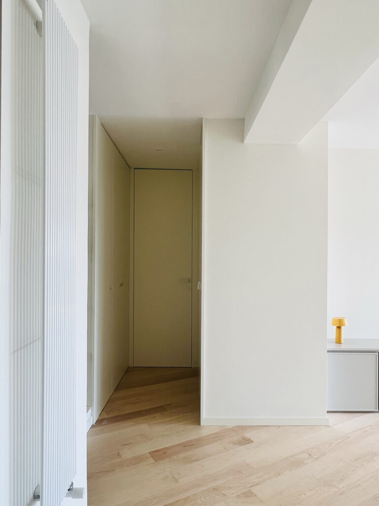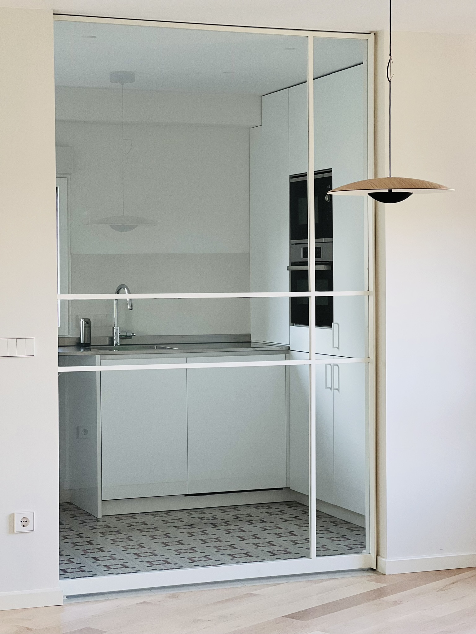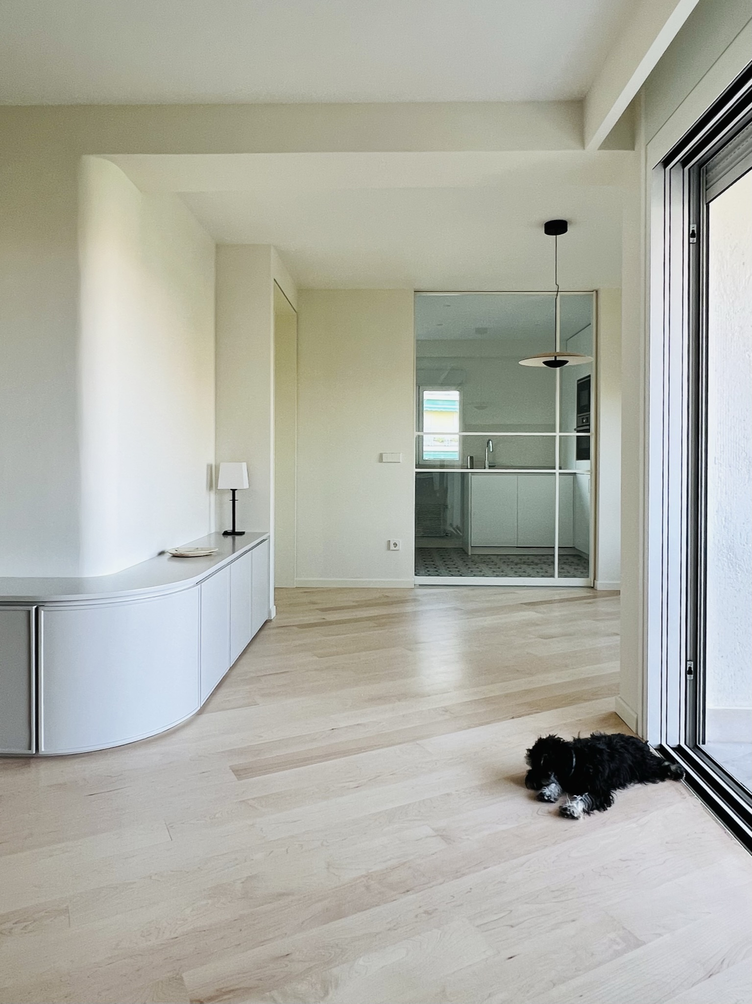 La elección de un suelo de madera de arce maciza combinado con mosaicos diseñados reflejan el carácter y la personalidad de la propietaria. La disposición de las tablas del suelo guían la mirada desde el acceso de la vivienda hacia los grandes ventanales que enmarcan el paisaje. Un mueble a medida  abraza los paramentos verticales del salón y comedor  generando un espacio comunicado  y acogedor. Se curvan ciertas esquinas para suavizar la relación de los espacios contiguos aportando gran sosiego y armonía a la casa.