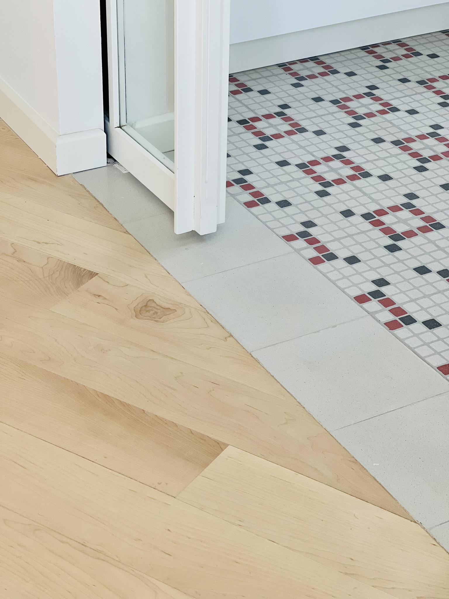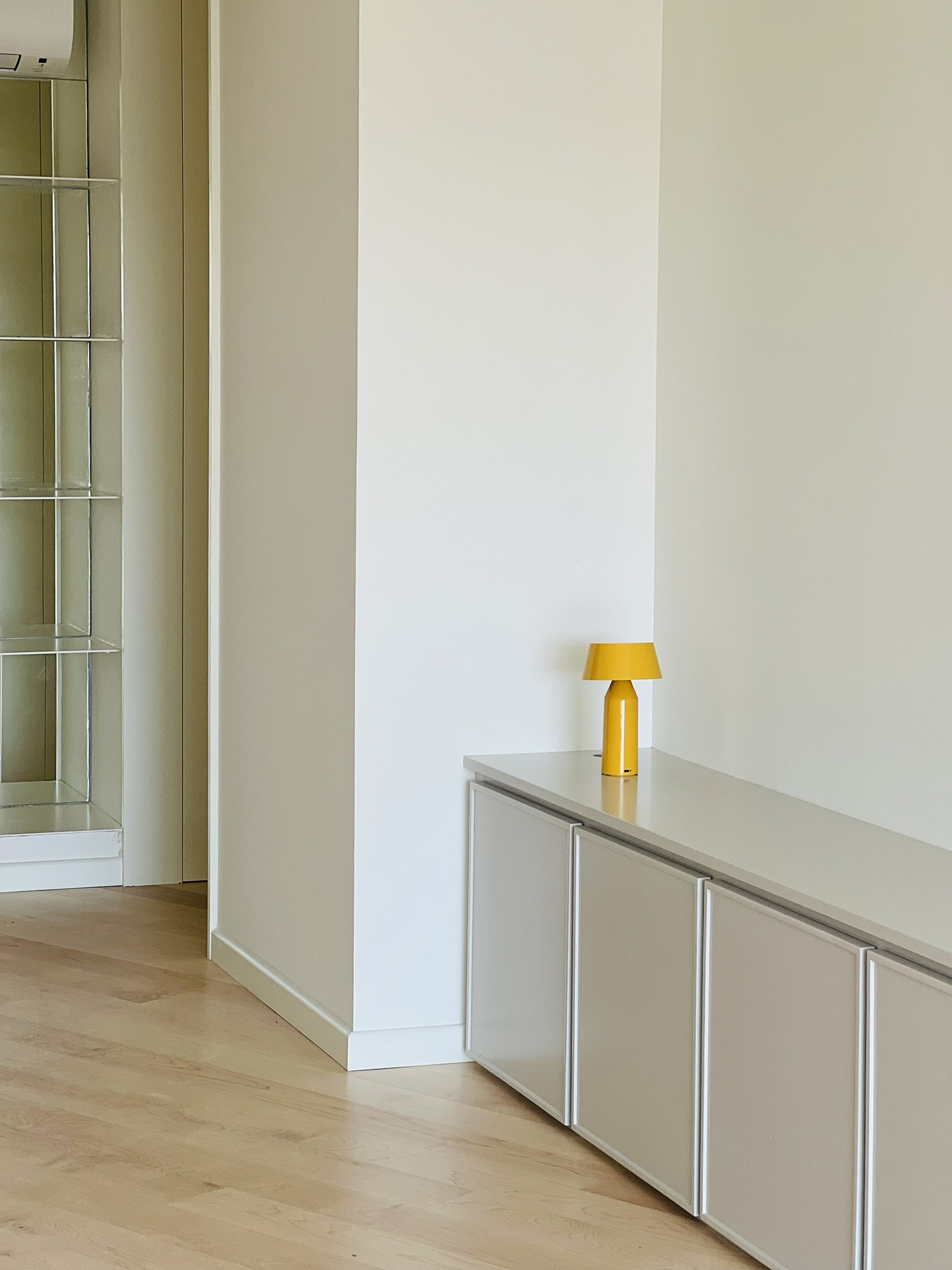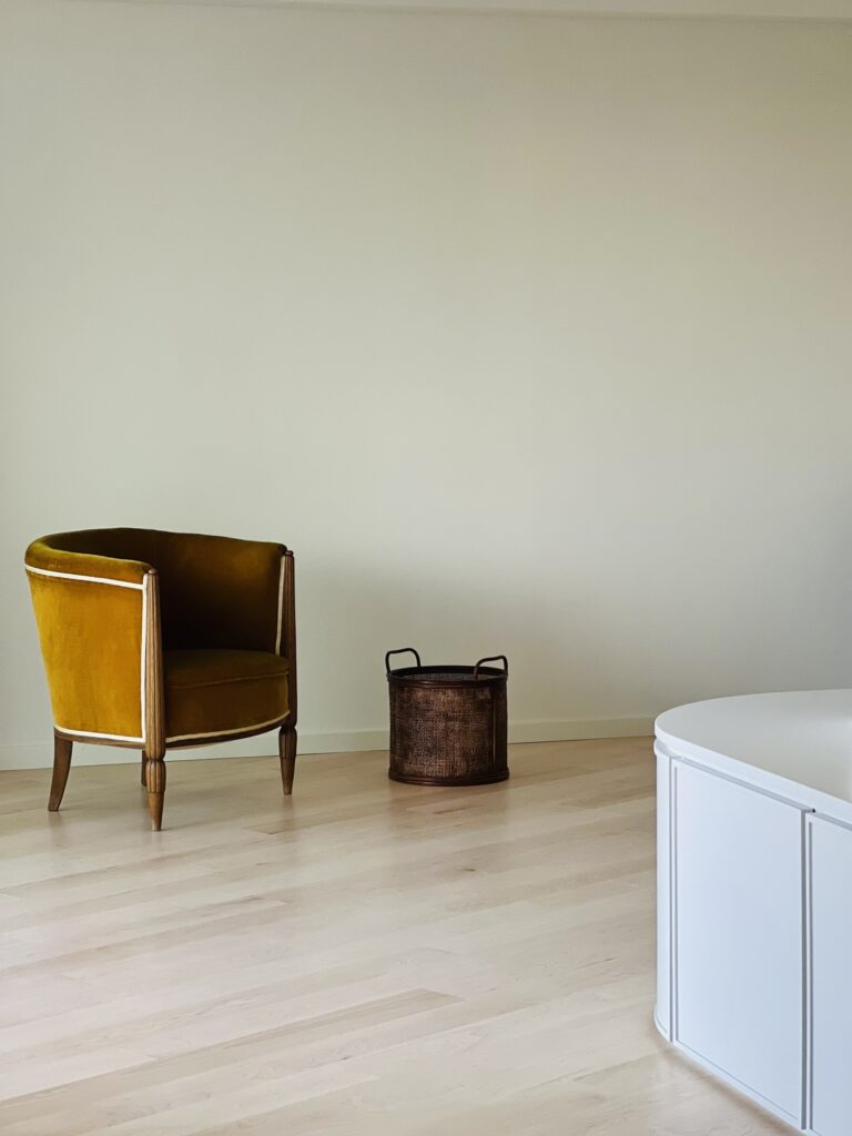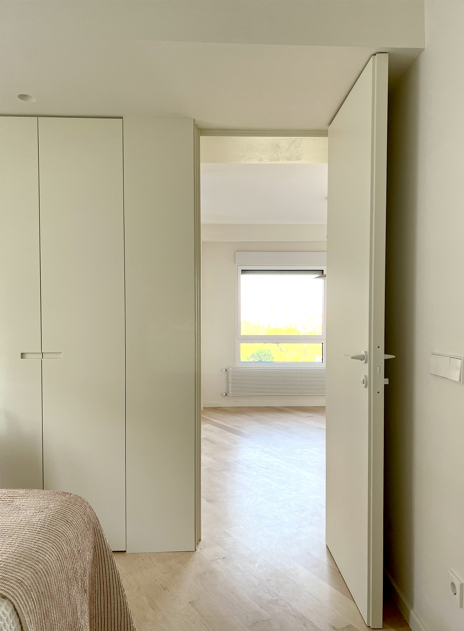 La elección de un suelo de madera de arce maciza combinado con mosaicos diseñados reflejan el carácter y la personalidad de la propietaria. La disposición de las tablas del suelo guían la mirada desde el acceso de la vivienda hacia los grandes ventanales que enmarcan el paisaje. Un mueble a medida  abraza los paramentos verticales del salón y comedor  generando un espacio comunicado  y acogedor. Se curvan ciertas esquinas para suavizar la relación de los espacios contiguos aportando gran sosiego y armonía a la casa.