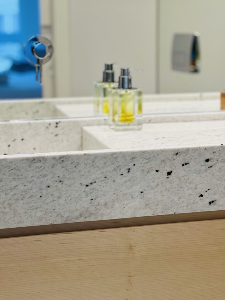 La elección de un mármol especial combinado con el diseño de los mosaicos y la madera de arce en los muebles aportan distinción a los baños.